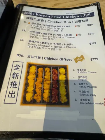 某平日嘅lunch,帮衬这间隐蔽嘅韩式餐厅🥸间店嘅位置都真系几隐蔽同隐世,唔系位于啲大街大巷,我谂主要靠街坊/学校/外卖生意店员系唔识讲广东话,但好nice不过,作为平日lunch嘅价位,啲set唔算特别平酱油猪肉便当($78)。便当包餐汤、饮品;个人觉得啲配菜几好食,eg 玉子卷、莲藕渍物,不过酱油猪肉我嫌比较干身,食落偏肉碎,唔算一块块,所以整体觉得比较普通五味炸鸡($239)。双重芝味+经典原味+蜜糖芥末+特色甜辣+洋葱蛋黄。这个炸鸡拼盘好好食!而且鸡肉唔细旧,份量每款5旧,多人一齐食先好叫🤣我个次有5个人食,但我地细食得济,饱到要打包剩低嘅走1. 双重芝味: 🧀 芝士酱浓郁绵密,炸鸡外酥内嫩,双重口感超满足,芝香爱好者必试! 2. 经典原味: 🍗 金黄酥脆不腻口,肉汁饱满锁系入面,简简单单都已经够好味! 3. 蜜糖芥末: 🍯 甜中带微芥末香气,甜辣平衡不腻,越吃越上瘾! 4. 特色甜辣: 🌶️ 韩式风味甜辣酱,辣度温和易入口,经典必点款! 5. 洋葱蛋黄: 🧅 咸甜交织,食落都有少少蛋黄沙嘅口感,令我想keep住放入口食😂…查看更多