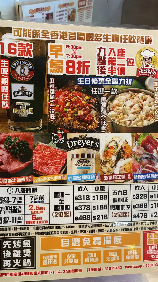 可能係全香港最多生啤任飲既火鍋餐廳任食羊腩、雞煲海鮮火鍋放題、🔥任夾海鮮+任食雞煲羊腩煲.又係打邊爐嘅好時間🥢呢間火鍋店位於屯門仁愛堂,主打任飲生啤.任食雞煲火鍋+自助海鮮價錢方面,星期一至四食2.5小時每位$378,任食6小時$468,週末公眾假期就每位加$10!仲有每晚9點後第二位半價.兩位起首先會送上麻辣雞煲🐔之後枝竹雙冬羊腩煲或加一次性醉雞煲🍲(2選1)四位或以上可以三款包晒,而且兩款煲都可以任食無限添加~所有煲醬汁都係獨門配方製作而成,肉非常多夠晒惹味。只要滿四位可以食埋花雕醉雞煲🐓之後用返煲精華打邊爐,亦可以免費轉換自選湯底,+$28就鴛鴦湯.火鍋配料最吸睛嘅,必定係自助區嘅海鮮Corner 🦐所有海鮮都係任夾,而且就咁睇款式同用料都不馬虎,有蟶子、膏蟹、大蜆花甲、大蝦、鮑魚脆肉鯇等等🐟一開始加多啲蟹同蝦湯底,最後個湯就會好鮮甜!肉類方面A5薩摩牛大米龍、安格斯牛頸脊無限追加🥩無激素黑豚肉係餐廳第一大賣點,就係有16款生啤自己任添任拎🍺飲多幾杯都回本!包括大熱Suntory 黑白啤、惠比壽、1664 blanc、Murphy’s ,Hoegaarden就連少爺啤都係任飲㗎🍻甜品方面提供多款名牌雪糕,包括Movenpick同dryers,就連糯米糍都有得成盒拎@foodie_forfood#foodie_forfood#hkfoodie#香港美食 #HKFood #屯門美食 #食盡屯門 #雞煲放題 #雞煲 #火鍋 #火鍋放題 #任食火鍋 #打邊爐 #放題 #任食 #羊腩煲 #任食羊腩煲 #任食雞煲 #屯門火鍋 #屯門放題…查看更多