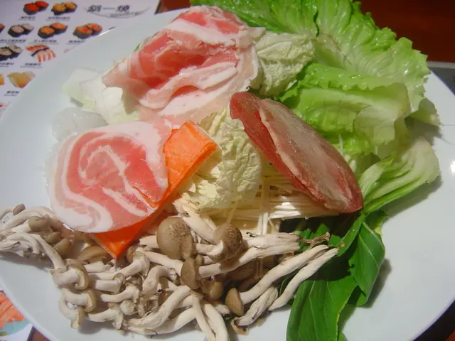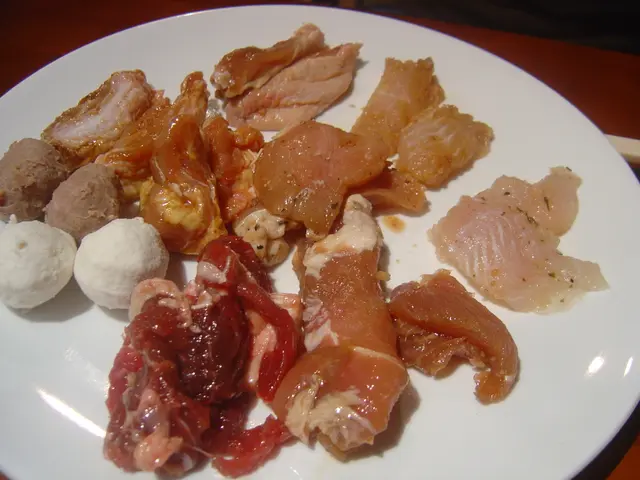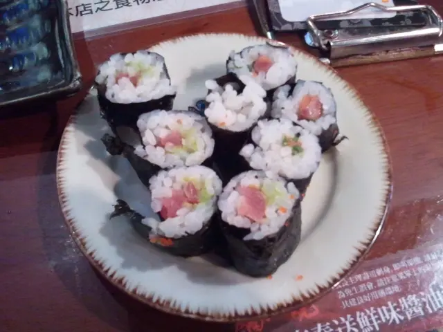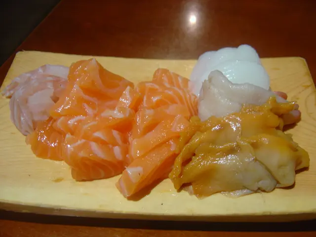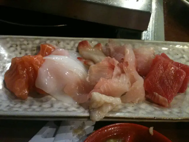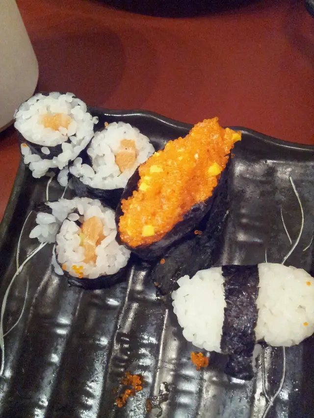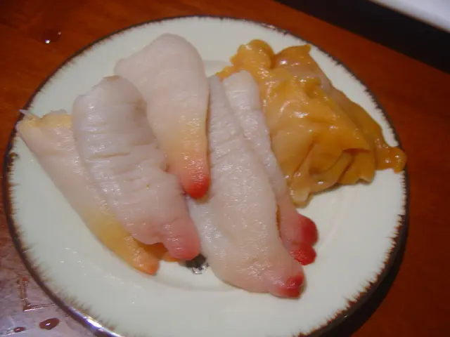 左:鯛魚,中間:三文魚,右前:赤貝,右中:象拔蚌,右後:墨魚
