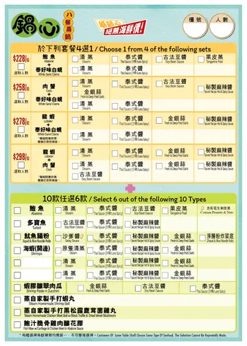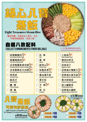 两老系锅心fans,今晚补祝父亲节,嚟食锅心八鲜蒸锅。虫草花炖汤足料清甜,劲好饮。海鲜拣咗龙虾、鲍鱼、多宝鱼、蛏子、海虾、白蚬,全部都几新鲜。龙虾同海虾仲有膏😛每款海鲜可选唔同蒸法:清蒸、金银蒜、果皮蒸、豆酱蒸等,口味多元。两老钟意清淡啲,所以大部分拣咗清蒸。店员会帮忙控制火候与计时,避免蒸过龙👍🏻 服务态度唔错又爽手,仲唔收加一。八宝蒸饭可自选配料,份量十足,一人分到两碗以上。最后仲有糖水作结,清润解腻。查看更多