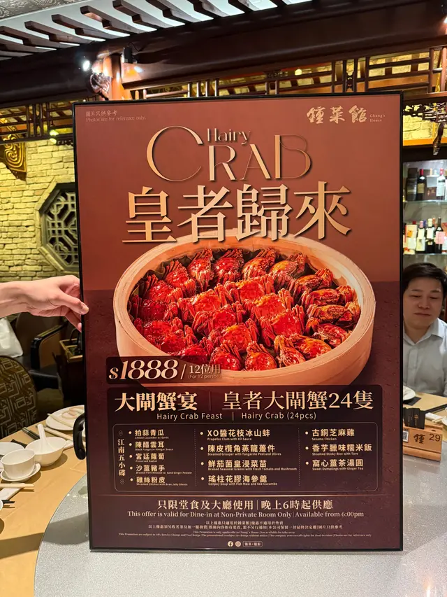 終於等到大閘蟹季節了,有話「九圓十尖」,我就認為始終蟹公比較好吃,因爲蟹公膏軟滑、味濃郁,而蟹乸膏色深黃較吸睛但其實質較硬,所以最完美是可以一公一乸配合一對吃!香港各大食肆都會推出大閘蟹套餐,今年我覺得「鐘菜館」的最抵食,一個套餐有三隻蟹,一公兩乸,估計都有四兩,平日自己買都是這個體積,吃得滿足,每位$398,仲有多款小菜。程序上也很好,首先送上滋補燉湯,這晚是[杏汁白肺湯],清潤可口!然後來小吃三款,[宮廷蘿蔔、沙薑豬手、拍蒜青瓜],最欣賞豬手,炆得非常軟腍入味。[大澳海山骨],肉質肥美,炸得香脆。暖胃了之後,主角來了,[清蒸天閘蟹] 2人2公4母!打開之後好開心,蟹膏金黃澎湃,甘香味美,蟹公的膏幼滑,佔在肉上,真是極品!蟹乸啲糕比較硬,但顏色亮麗吸引。加$98元有一瓶花雕酒,未嘗不可。慢慢品嚐完大閘蟹之後,通知服務員上其他菜式,[油鹽水石斑魚],龍躉肉嫩滑,蔥、豉油及味道皆處理得恰到好處。[鮮茄菌皇浸菜苗]與[香芋糯米飯],加了香芋,口感添層次,糯米飯黏條味道好。[圓肉薑茶],夠火喉,感覺即時解蟹的寒氣。環境寬敞,佈置得很有中國特色,服務態度友善,星期日生意唔錯,因為推出很多優惠,又真是太抵食!例如12人的大閘蟹套餐只是$1888。抵食過自己煮的「今晚有好餸」!#鍾菜館 #灣仔 #粵菜 #海鮮…查看更多