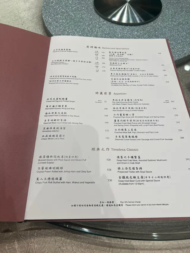 This famous restaurant is traditionally known for its roasted goose, but since the dispute of the Kam family which led to the separation of the brothers opening their own restaurants, I have not visited them. Today, I came to Yung Kee to see what has changed over the years.The décor has a modern and neat design, totally not the type you would expect from a Chinese restaurant that has opened since 1942. Seated at a table at the far end, with windows on the side offering a glimpse on Wellington Street, it is pleasant and comfortable.We have a combination of the signature dishes plus the seasonal chef’s selection, starting with their famous Signature Charcoal Roasted Goose 正宗炭烧黑鬃鹅 ($300). This normal portion is good for 2-3 people, with the goose not fatty and the meat quite tender. The taste on its own is nothing special, but after adding a bit of plum sauce it is better. I found the skin is not crisp and honestly, I think the quality of its goose has deteriorated, and inferior to Kam’s Roast Goose or the ones in Sham Tseng.Next, we have Almond and Pig’s Lung Soup 杏汁滋补猪肺汤 ($180 each). The soup has a delicate almond note, with the lungs washed thoroughly so there is no weird taste. There are other ingredients like gingko, pork, and bean curd sheet added too. While it tastes good, it is less delicious than another traditional restaurant Lin Heung Tea House that I recently visited. And in my opinion the soup will be better if it can be served steaming hot.From the seasonal menu this dish caught my attention. The Stir-fried Frog’s Stomach 皇冠翡翠戏藏龙 ($380) is using the special ingredient - frog’s stomach, which looks like large pearls, with a nice crunchy bite. Together with asparagus, gingko, yellow ear, brown fungus, pine nuts and Tonkin jasmine, it has a nice, delicate taste and is a great dish for summer. After the slight disappointment from the first two courses, this one helps to rescue some marks.Another dish on the main menu is Braised Garoupa's Belly with Yanmin Sauce 银棯酱炆鲜斑腩 ($450). Served in a sizzling hot pot, the large grouper flesh is tender and seasoned well, highly fragrant from plenty of shallot and ginger, and not greasy nor does it feel too oily. The yanmin sauce has provided slight acidity to help balance the flavours. Fantastic and this is my favorite one on the night.We have also Fried Rice with Mini Crab Roe and Ginger 礼云子姜米炒饭 ($320). Another of my favourites, the fried rice is very nicely cooked, not oily and with each grain distinct, the chef has added the prized mini crab roes, which must have taken meticulous effort to get from the small crabs, to give an amazing umami taste. With some small pieces of chopped ginger and scallions to add fragrance and balance, the portion is good for four bowls, and we basically finished them all in no time.For dessert, my wife has Red Bean Sweet Soup with Aged Tangerine Peel 远年陈皮红豆沙 ($55) while I go for Black Sesame Sweet Soup 生磨绵滑芝麻糊 ($50). Both sweet soups are nice, not too sweet, with good fragrance from quality aged tangerine peel and the grinded sesame respectively.Service is good, with the staff attentive, but again, as I have shared frequently, should introduce more details to allow the diners to learn and appreciate the dishes more. The bill on the night is $2,172. Overall, still a nice Chinese restaurant but given its fame I believe there are more expectations, and the roasted goose is honestly a bit disappointing.…查看更多