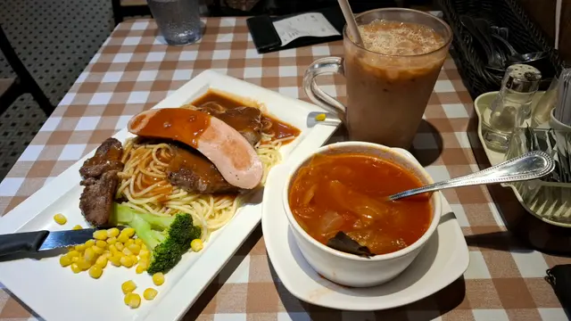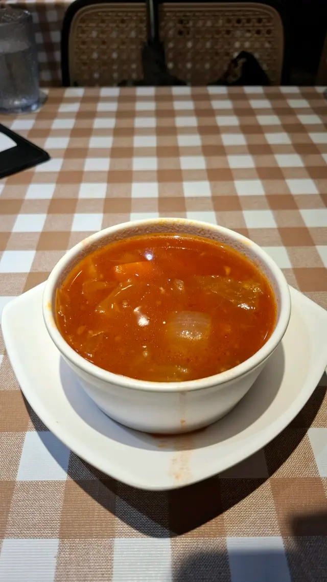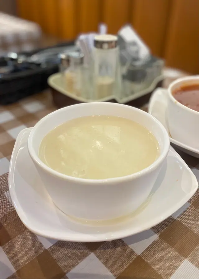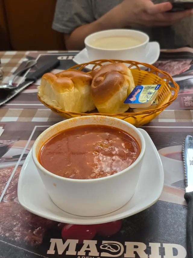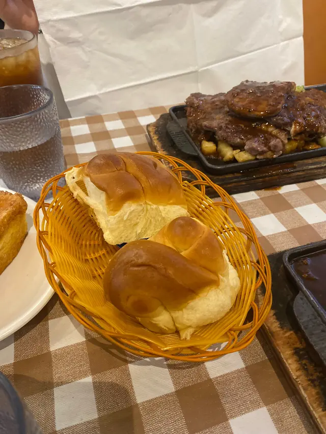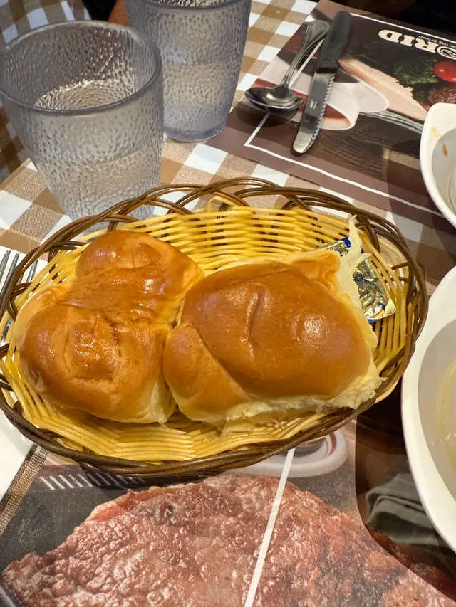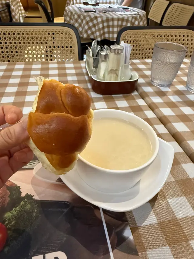 中意膠格仔枱布,好耐無見啦餐湯有紅湯或者白湯,跟餐包牛油除咗塗滿餐包之外記得要加小小入白湯忌廉味會更濃郁~所有扒都跟薯菜,唔係普通薯氣而係波浪粗薯條﹗