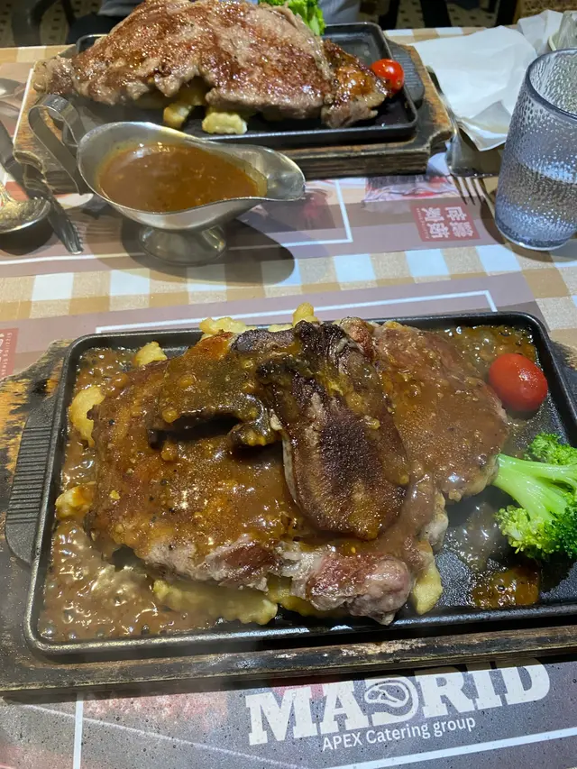 意粉都會有額外嘅汁有黑椒或燒汁兩種黑椒夠香口但唔會好辣,怕辣嘅男朋友都食到~鐵板牛舌拼肉眼 $158好吸引嘅組合,一睇menu就比佢吸引