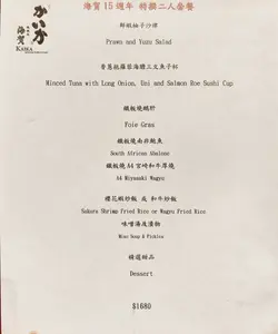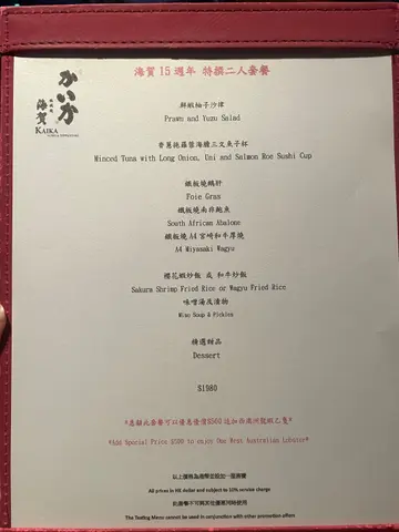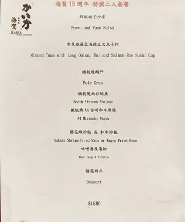 今日去咗呢间尖沙咀The ONE 19楼铁板烧,一坐低就可以饱览维港海景!我哋叫咗海贺15周年 特撰二人套餐,非常抵食1️⃣ 鲜虾柚子沙律 🦐🍊 柚子汁酸香十足,开头食已经好开胃!鲜虾够大只,新鲜爽口,啱晒做前菜。2️⃣ 香葱拖罗蓉海胆三文鱼籽杯 🐟🍣 味道偏鲜甜,拖罗蓉有阵阵鱼香,好想即刻捞白饭食。三文鱼籽大量又鲜甜,海胆Creamy得嚟仲带少少海咸味,好正。3️⃣ 铁板烧鹅肝 🦆🍞 鹅肝唔算厚,但两面烧得超脆,配多士食尽显油香。黑蒜酱香味浓郁,吊出鹅肝鲜甜味,食完回味无穷。4️⃣ 铁板烧南非鲍鱼 🐚🔥 简单调味,食出鲍鱼本身嘅鲜香。肉质爽弹,加埋鱼肝酱更提鲜。烧鲍鱼肝好特别,肝味浓郁又唔腻。5️⃣ 铁板烧 A4 宫崎和牛厚烧 🥩🧄 五成熟啱啱好,油脂丰富入口即溶,牛味浓郁。两款酱各有特色:辣根酱轻轻带辣,突显牛肉鲜味;另一款有蘑菇同酸醋味,酸酸甜甜帮手解腻。再配炸蒜同蕃茄仔,成碟食材好丰富!6️⃣ 樱花虾炒饭 & 和牛炒饭 🍚🍤 铁板炒饭火喉足,粒粒分明,樱花虾同和牛嘅香味好突出,味道层次丰富。7️⃣ 味噌汤及渍物 🍲🥒 味噌汤暖胃收尾,渍物酸酸甜甜好醒神,帮手清味蕾。8️⃣ 精选甜品 🍵🍡 抹茶蕨饼同黄豆蕨饼软糯香甜,配红豆蓉食更添风味,为整餐画上完美句号。💰 二人套餐 $1680,偶尔放肆食一餐,睇住维港夜景再加上丰富铁板烧体验,绝对值得!…查看更多