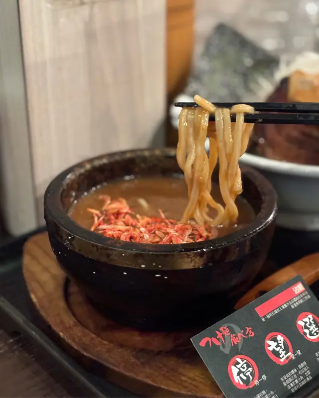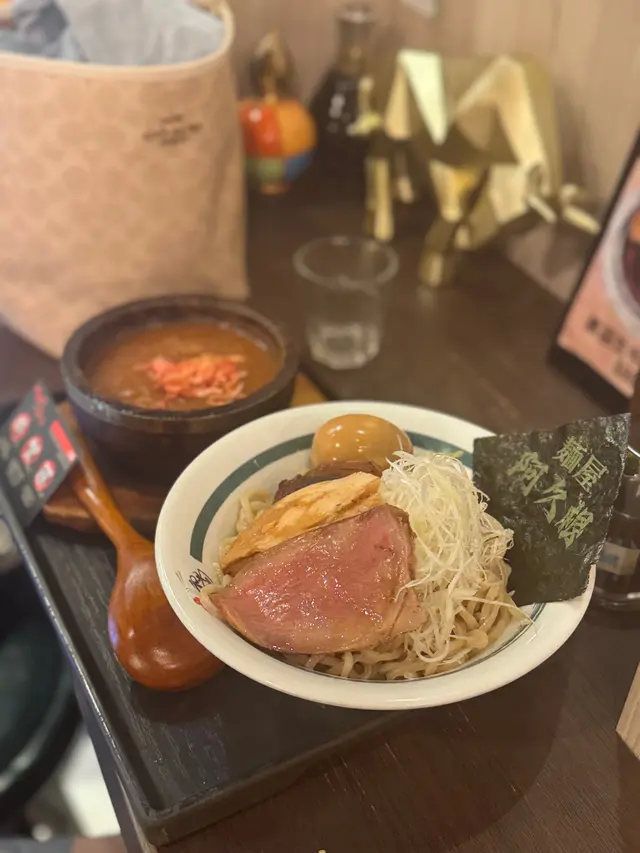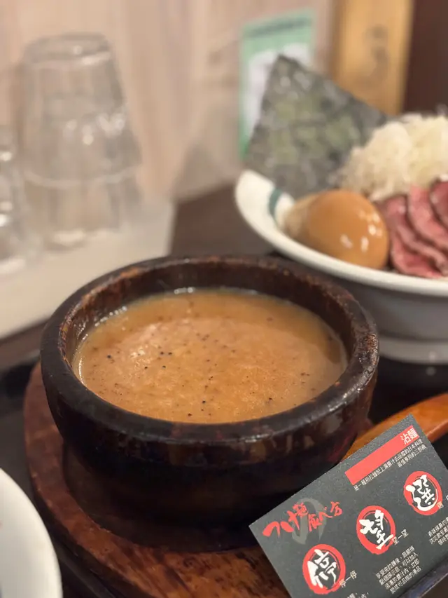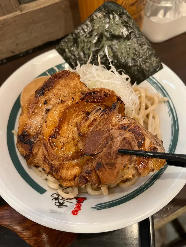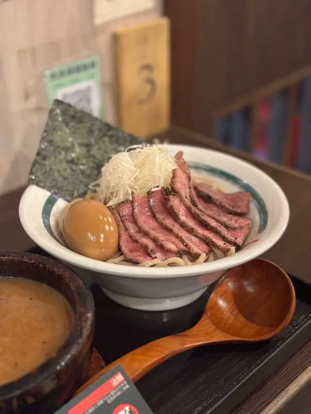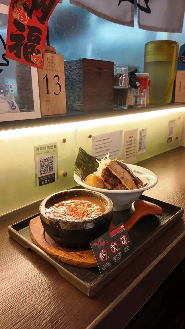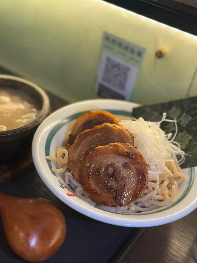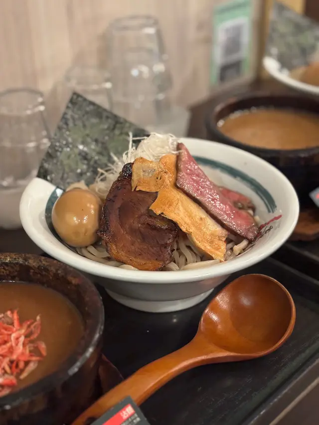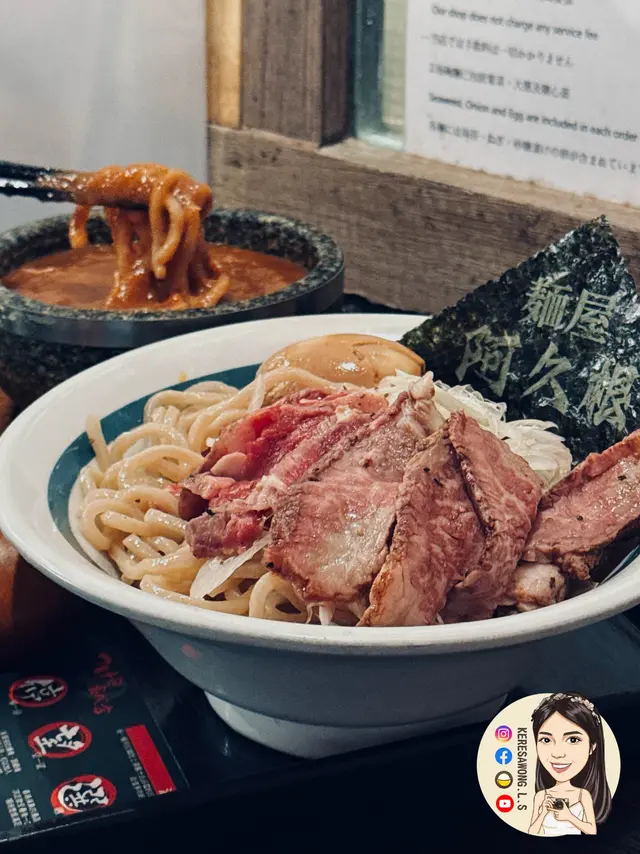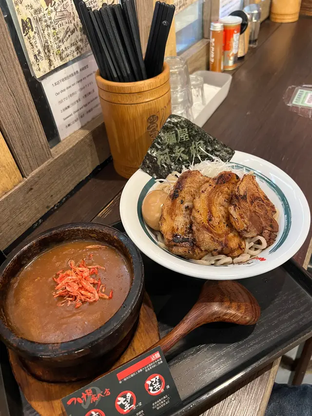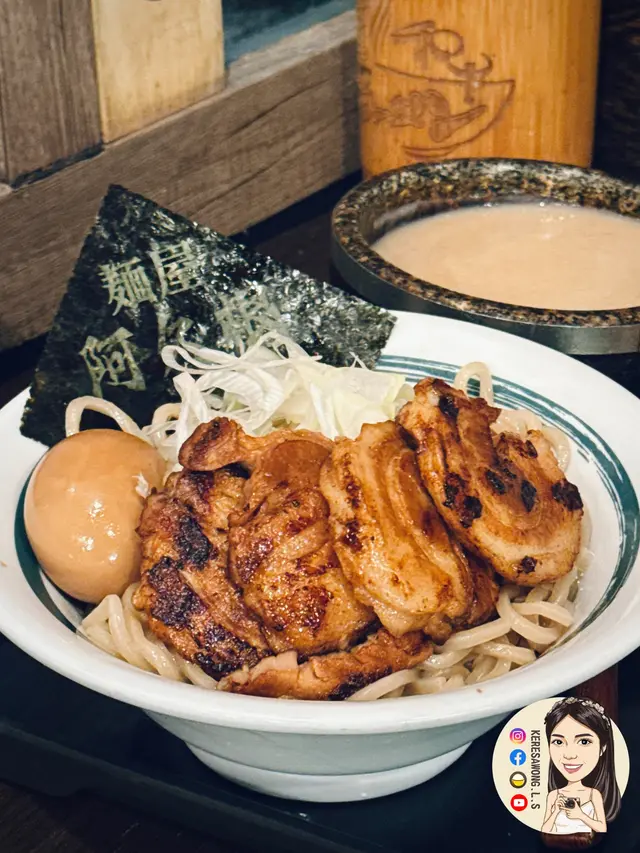 同朋友睇完戲係附近搵食, 隨意入咗呢間日本麵食小店, 餐廳面積不大, 全吧檯座位, 雖然唔算坐得舒服闊落, 反而感覺很有日本地道拉麵小店嘅和風感覺, 食物水準至上, 而且全日免加一, 搶返唔少分數。呢度主打湯拉麵同沾麵, 另有數款小食選擇。沾麵隨餐奉上一張咭牌展示建議正確食用方法, 夠哂貼心!【人氣慢煮安格斯牛小排沾麵】HK$148自選: 濃厚味噌蝦湯味噌蝦湯以石鍋上, 如果可以再熱得滾下滾下就更好。味噌蝦湯味道如menu上所指嘅偏鹹一點, 味道鹹鮮易掛湯, 麵線QQ彈牙; 而主角安格斯牛小排分別有嫩紅刺身同埋炙燒過嘅熟和牛, 前者係咀嚼時食到和牛本身嘅筋絡, 後者口感比較林, 牛脂較出, 另配有原隻軟滑流心糖心蛋同埋京蔥。【味自慢炙燒豚肉沾麵】HK$115自選: 濃厚雞白湯幾塊表面燒得金黃有焦嘅厚炙燒豚肉, 選自五花腩, 肥瘦相間, 肥油層比例較少, 食落唔會感覺太油太膩, 肉質軟林有肉香。雞白湯同樣易掛湯, 濃郁鮮味。享用完沾麵後, 可以示意店員協助加清湯, 品嚐餘下湯汁精華, 因應個人喜歡嘅濃度而免費添加, 將整份沾麵餐盡吃, 滿足又飽肚。…查看更多