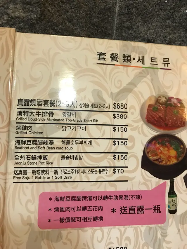 滿心歡喜諗住同朋友食飯,一入到黎成間野已經好大煙,配菜已經黎得4碟,重點係無泡菜,一間韓國餐廳可以無泡菜真係好搞笑!想食牛排骨又無,叫左個五花腩,泡菜薄餅,人參雞湯,辣牛肉粉絲煲4樣野!一開始黎左個五花腩都幾好食,等左一個鐘忍唔住催佢地,催完先黎個泡菜餅,勁普通仲要$120,再等多半個鐘見個湯都未黎就問佢,一開始話整緊,轉個頭話無哂囉,真係玩野,等左成粒鐘先話無,真係食到一肚氣,以後一定唔會再黎囉,完成浪費我時間