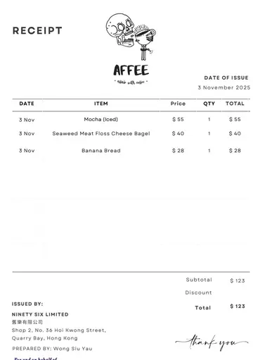 早排发掘咗呢间咖啡小店,一试爱上💛 今次再约朋友一齐去慢活一下,朋友都好欣赏☺️ affeehk 主打各款手冲咖啡,提供轻食: bagel🥯、pastries🥐 店舖面积唔大,提供三到四个座位。当日落大雨💧大约1pm去到,竟然冇人😳 可以坐低慢慢叹🥰𐄁𐄙𐄁𐄙𐄁𐄙𐄁𐄙𐄁𐄙𐄁𐄙𐄁𐄙𐄁 ☰ ᴍᴇɴᴜ 𐄁𐄙𐄁𐄙𐄁𐄙𐄁𐄙𐄁𐄙𐄁𐄙𐄁𐄙𐄁🍌•𝗕𝗮𝗻𝗮𝗻𝗮 𝗕𝗿𝗲𝗮𝗱• $𝟮𝟴🥕•𝗖𝗮𝗿𝗿𝗼𝘁 𝗰𝗮𝗸𝗲• $𝟮𝟴两款之前试过觉得高质,所以今次再回购😆✨𝗕𝗮𝗻𝗮𝗻𝗮 𝗕𝗿𝗲𝗮𝗱带天然香蕉嘅甜味,加上合桃,进一步增添香气同口感; 𝗖𝗮𝗿𝗿𝗼𝘁 𝗰𝗮𝗸𝗲嘅甜度会比𝗕𝗮𝗻𝗮𝗻𝗮 𝗕𝗿𝗲𝗮𝗱稍为多少少🤏🏻 但系都唔会好甜🧡 玉桂味香浓,有一丝丝嘅红萝卜🥕 因为系纯蛋糕,冇忌廉芝士𝗳𝗿𝗼𝘀𝘁𝗶𝗻𝗴,所以整体比平时嘅𝗖𝗮𝗿𝗿𝗼𝘁 𝗰𝗮𝗸𝗲少一份腻感✨🍯•𝗛𝗼𝗻𝗲𝘆 𝗟𝗮𝘁𝘁𝗲• $𝟱𝟮比一般嘅𝗹𝗮𝘁𝘁𝗲增添一份蜜糖嘅自然甜味,饮落恰到好处,好舒服☺️🖤•𝗦𝗲𝘀𝗮𝗺𝗲 𝗢𝗮𝘁 𝗟𝗮𝘁𝘁𝗲• $𝟱𝟬超浓郁! 第一啖饮超有惊喜! 同朋友都觉得呢款饮品似系甜品(芝麻糊)🤣大家饮之前记住搅匀😆整体感觉温馨舒服,推介!⋆ ⋆ ⋆ ⋆ ⋆🐽 Overall : 8.5/10🐽 Revisit : Yes…查看更多