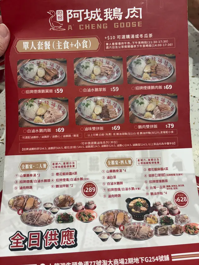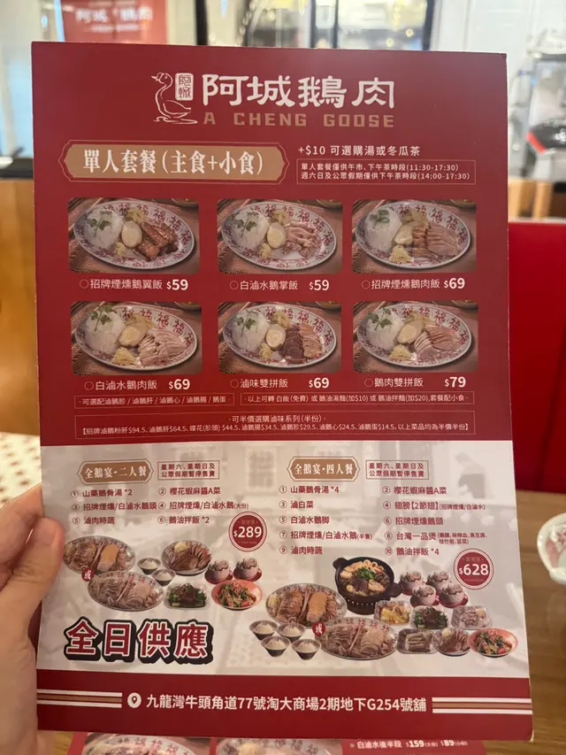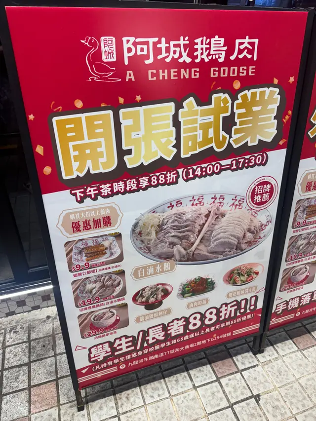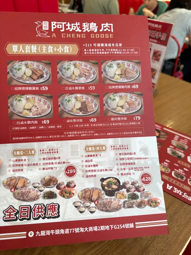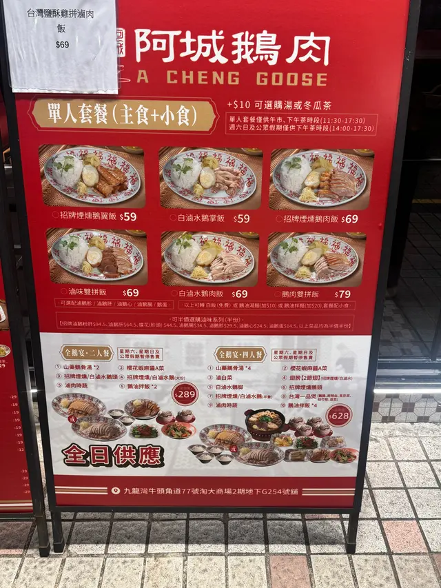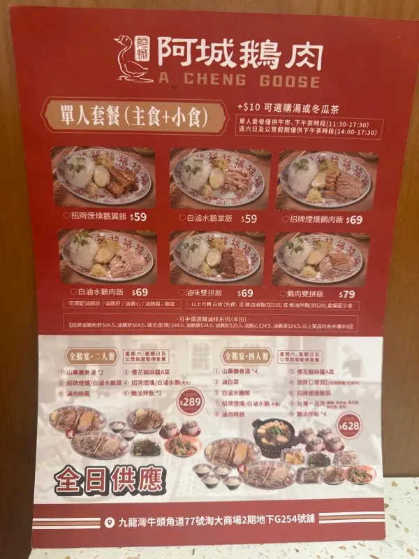 阿城鵝肉 (九龙湾) 网上订位即赚Rice Dollars 网址: https://s.openrice.com/QrLS0NQGD00 地址: 香港九龍灣牛頭角道77號淘大商場2期地下G254號舖 电话: +852 46440721