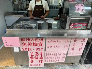 趁住国庆假期去元朗大马路度攞月饼先,废事等到中秋节前夕𠮶日大排长龙又好多分店冇货啦。唔知系咪关假期事,今日条小食街特别畅旺,间间都排晒队买。系鸡地悄悄结业嘅阿妈豆腐花,原来搬咗过嚟呢边,而家仲多咗小食卖添。⭐冻豆花天气咁热叫返杯冻豆花饮下先,系呀~你冇听错唔系豆浆系豆腐花,一杯可以饮嘅豆腐花😋杯豆花本身无糖,你可以要求加黄糖嘅,甜度仲可以自由选择添。甜甜地又滑溜,咁样饮豆腐花又几好味㖞。⭐麻辣鱼蛋仲叫咗份麻辣鱼蛋,一份有20粒😋虽然颜色好红但系食落其实只系小小辣,而且完全冇麻嘅感觉,我觉得叫香辣鱼蛋可能会贴切啲。⭐粢饭原来佢仲有粢饭卖,咁可以早餐嚟呢度买㖞😋粢饭加豆浆咪啱啱好啰。讲返件粢饭,都几大旧㗎,有手掌size。入面包咗油炸鬼肉松同榨菜粒,味道正正常常,饭就硬咗少少,不过可能放到三点几先嚟买啫,早餐时段新鲜做应该会好食啲。⭐芝麻卷最后就系芝麻卷,突然间文艺复兴多咗好多街舖做呢个失传嘅小食,呢间个芝麻卷都几香芝麻味,入口烟烟韧韧滑捋捋,都唔错呀😋几十蚊食到咁多嘢😋间唔中出嚟扫下街,心情都好啲。…查看更多