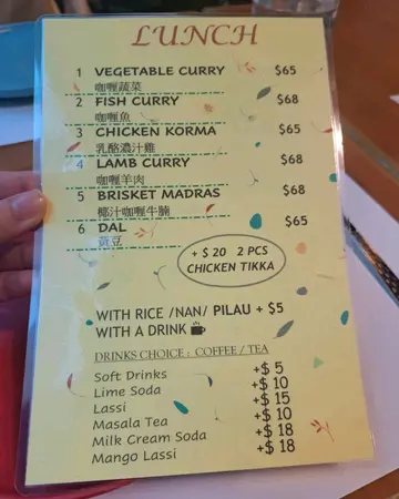 Went to this resto, recommended by my brother, with my colleagues for lunch. .I ordered Lamb Curry with Nan. The lamb was truly tender and not too fatty. It absorbed the flavours of the curry nicely, but the portion was a bit small. The nan was served hot and delicious with butter. Dipping it in the curry enhanced its savoury taste. My colleagues ordered Fish Curry with Rice and Chicken Korma with Nan respectively. The fish curry was soft, while the chicken korma was meaty. I personally preferred the creamier chicken korma..The lunch set included coffee or tea, and didn't have any service charge, so the price was quite economical. The seating was quite comfy and there were not a lot of ppl. …查看更多