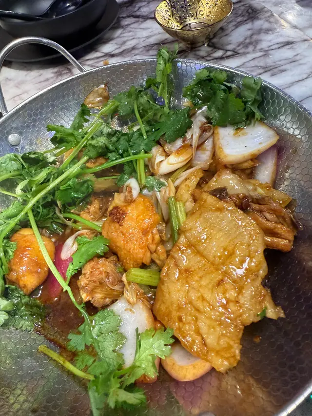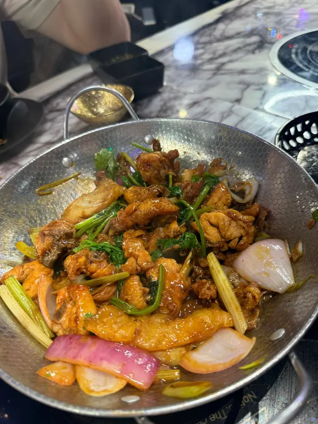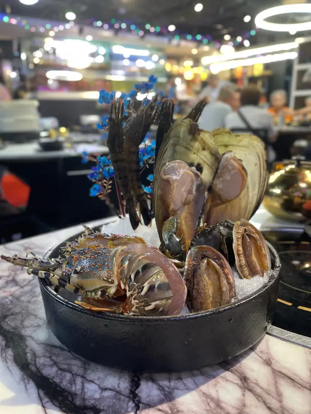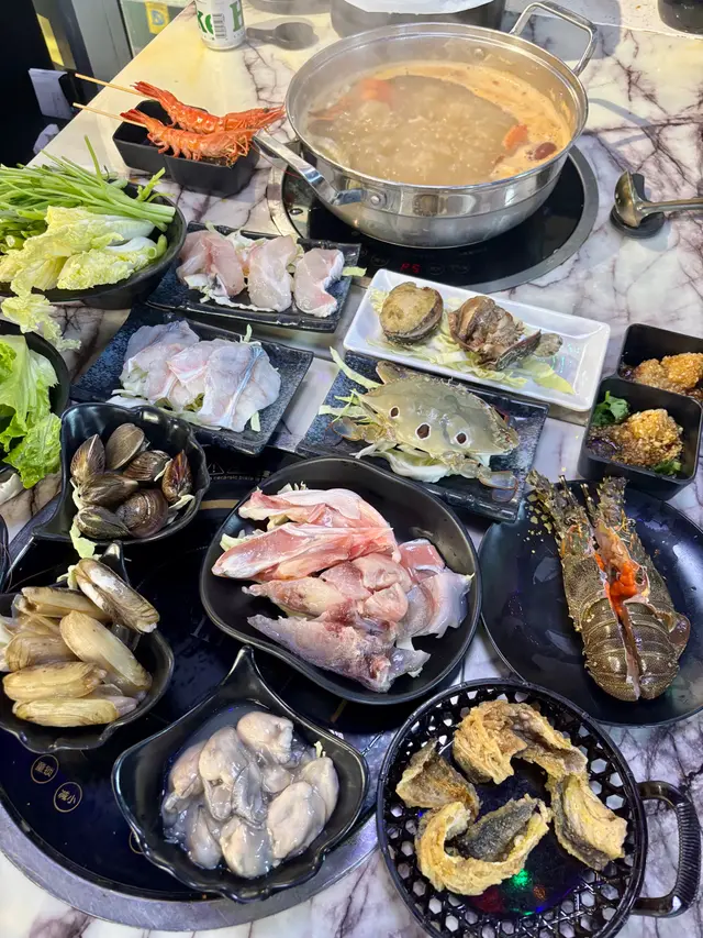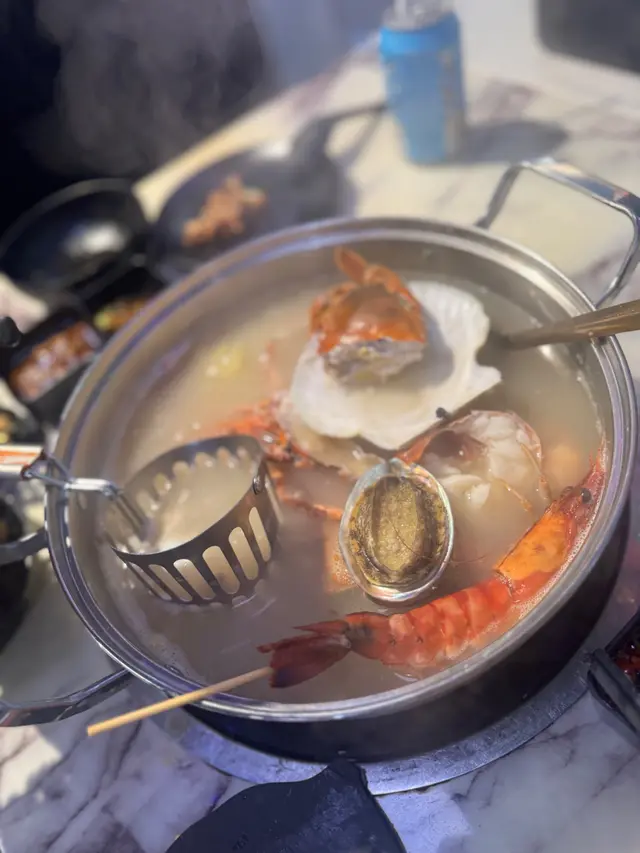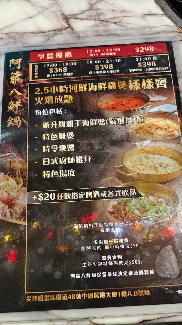 尖沙咀人氣火鍋放題餐廳推出超值早鳥優惠,下午 5:00 至 7:00 時段每位只需 $298,啱哂習慣早吃晚飯的我和先生。用餐前,餐廳會先奉上以茶壺盛載的時令燉湯,湯色清澈、味道鮮美,喝完即刻開胃。之後可選不同風味的雞煲,包括泰式酸辣雞煲、花膠雞煲、韓式芝士雞煲和四川麻辣雞煲。我們選了花膠雞煲,花膠炆得軟腍入味,雞肉嫩滑惹味,非常滿足。吃完雞煲後還可以更換湯底繼續打邊爐,湯底選擇多樣,有辣有不辣,我們選了椰子雞湯,香甜清新。接著,餐廳送上超豪華的霸王海鮮盤、手切安格斯牛肉和炸門鱔魚皮。海鮮盤包括龍蝦、鮑魚、虎蝦、台山奄仔蟹和蘇格蘭元貝,每款都新鮮十足。火鍋配料選擇非常多,單是海鮮就有珍珠蠔、鱔片、龍躉腩、大魚頭、大蜆、蟶子、海蝦、三點蟹等,我們每樣都點了一份,海鮮新鮮又乾淨,吃得非常安心。喜歡的還可以重複再點,另外還有手打黑松露墨魚滑、安格斯牛、新鮮滑牛肉、黃砂豬潤等高質食材,最後來點青菜作結。以上所有單點食物都是任食的!其實還有很多選項我們根本吃不下了。餐後還會送上水果拼盤,感覺非常貼心有誠意。而飲品方面,每人只需加 $20 就可以任飲,餐廳更貼心地不收醬料費,用餐體驗大大加分!…查看更多