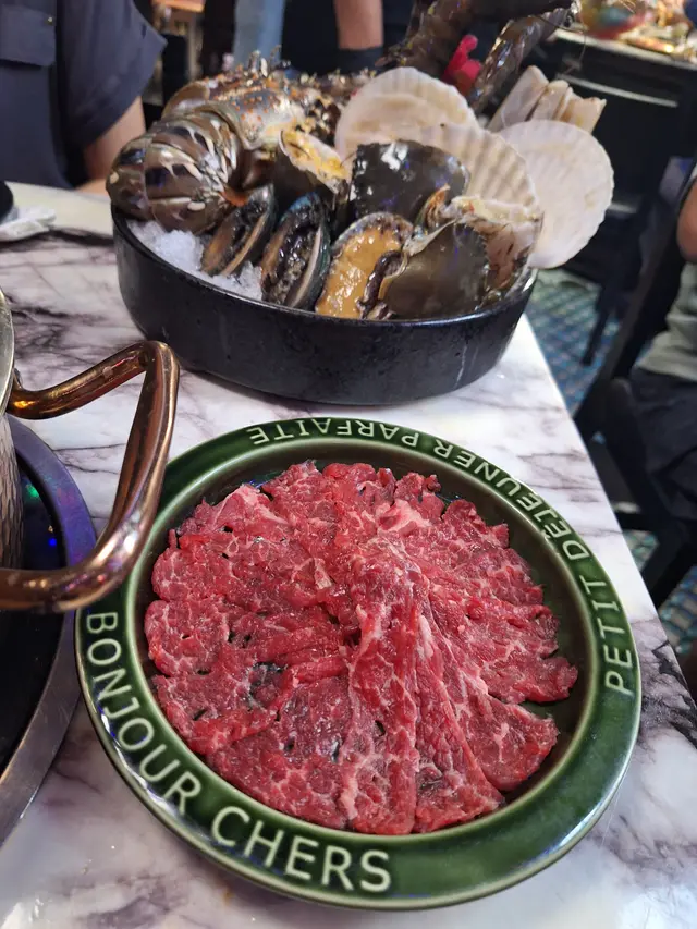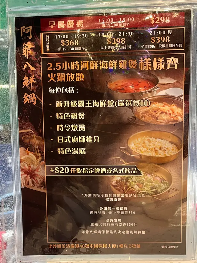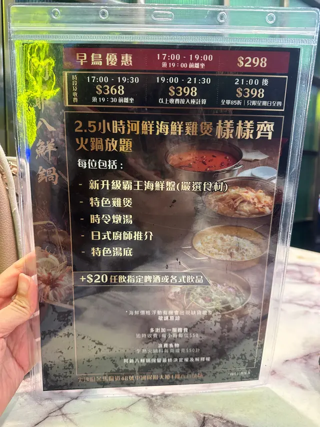2.5小時海鮮雞煲放題 (早鳥 $298)1️⃣新升級霸王海鮮盤(嚴選食材):- 有蟹、龍蝦、鮑魚、扇貝、大蝦- 全部海鮮都勁鮮甜,尤其係蟹同龍蝦,勁大隻勁厚肉,食落啖啖肉又滑🤩 另外想大讚係店舖處理得好好,海水味唔會搶咗,亦唔會太咸✨✨而且啲海鮮上菜時係仲郁緊嘅!!!呢個價錢食倒活海鮮好感動😋🦞2️⃣特色雞煲: 有辣有唔辣,推介唔辣嘅花膠雞煲,花膠好大舊,淋得嚟又入味,啲雞都好香,唔夠仲可以加😄食到呢度都飽咗一半,所以建議留肚打邊爐!!!!😆 3️⃣時令燉湯: 龍骨石斛湯,好清甜滋潤冇味精,勁好飲!4️⃣日式廚師推介: 刺身拼盤- 赤蝦肉質爽脆,鮮味突出- 吞拿魚蓉,入口即化,配蔥花提升鮮味- 章魚彈性十足,口感爽滑,味道較清淡- 鮑魚切片質地煙韌,咬感紮實- 油甘魚油脂豐厚,入口滑溜5️⃣安格斯牛肉,肉質軟淋而滑,牛味都好出,唔嚡6️⃣打邊爐仼食配料✨推介:👍🏽珍珠蠔: 漲卜卜,鮮甜蠔味重👍🏽大蜆: 大大粒鮮甜爆汁👍🏽蝦滑: 彈牙鮮甜,入口滑溜唔黏口👍🏽海蟹: 膏香濃郁,蟹肉鮮嫩啖啖肉👍🏽脆肉鯇魚: 爽脆有咬口👍🏽魚腐: 吸湯入味一啖爆汁7️⃣飲品+$20 仼飲 多選擇,必加!lgable打卡度:9/10好味度:9/10worth revisiting返兜度:9/10#尖沙咀美食 #海鮮仼食 #打邊爐 #新鮮…查看更多