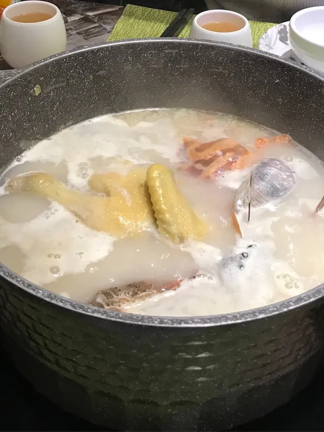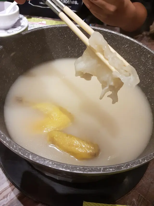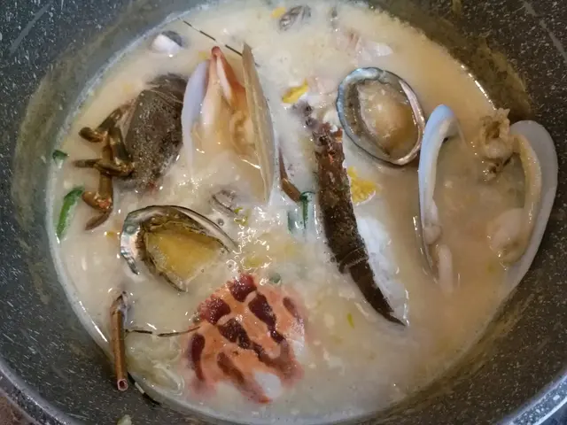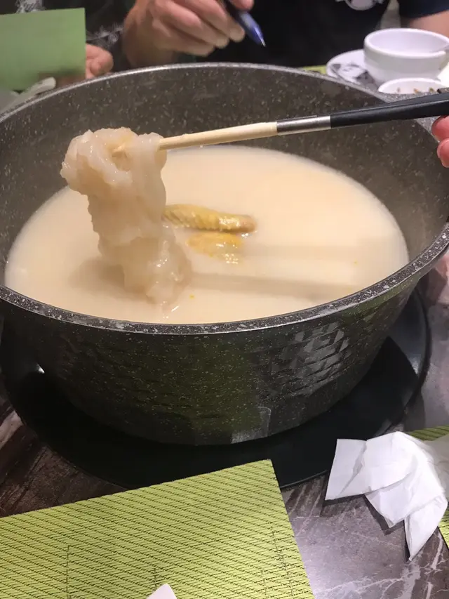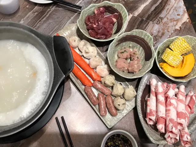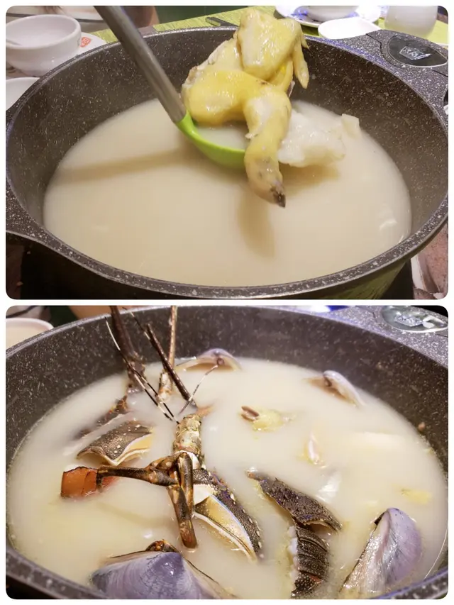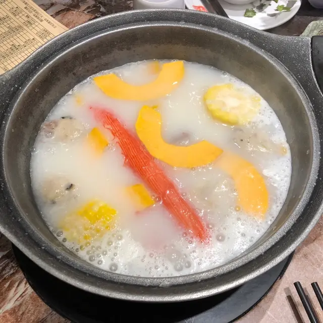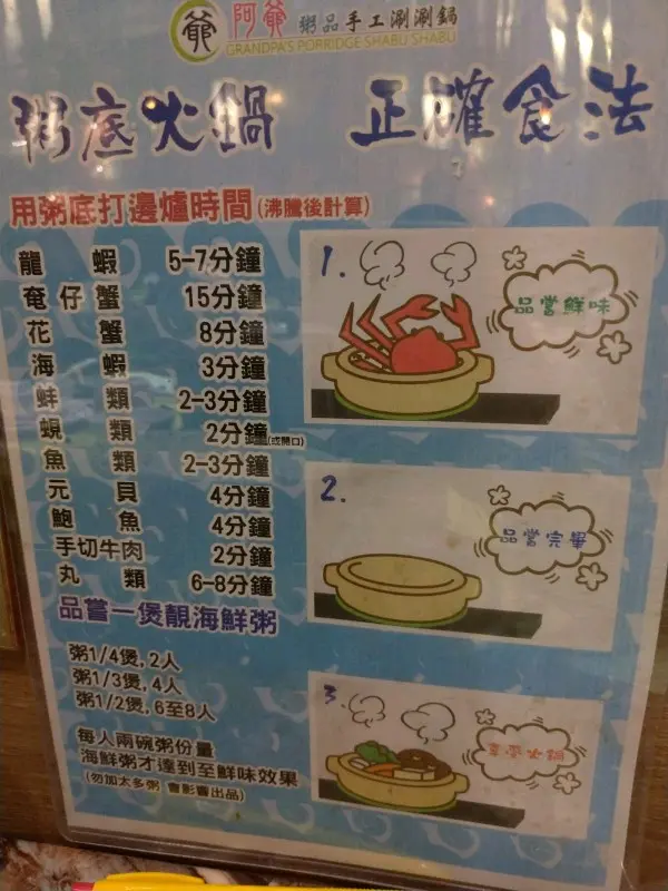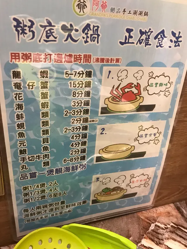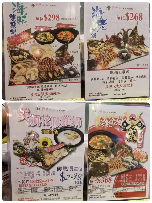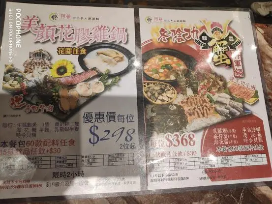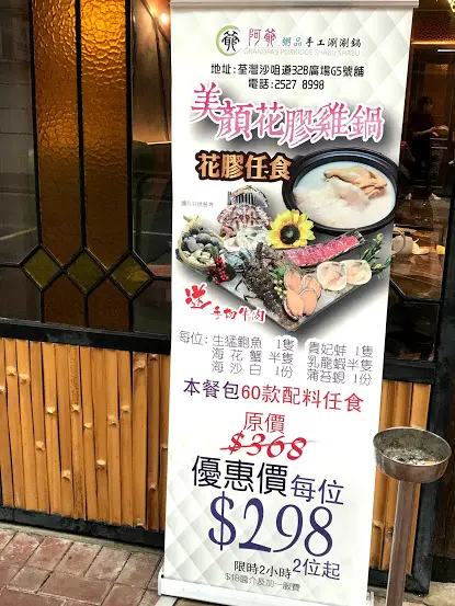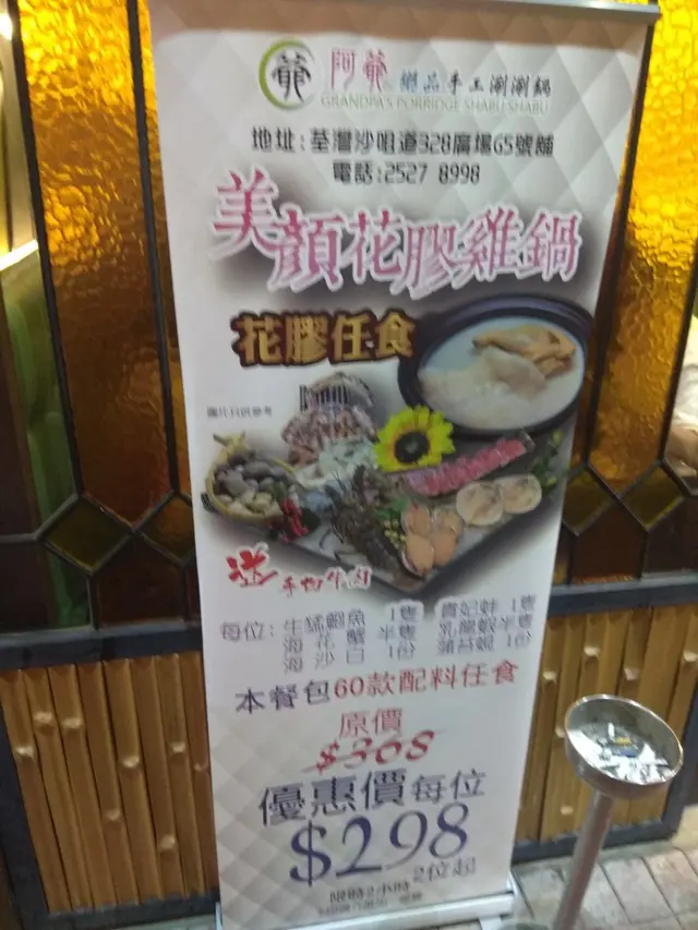 阿爺粥品手工涮涮鍋,位於繁盛的街道上,旺中帶靜 ,地方頗闊落,侍應招呼十分熱情。這天選了美顏花膠鍋 $298/位花膠份量非常多,爽滑有彈性, 感覺很滋潤。海鮮拼盤有龍蝦鮑魚和活蟹,鮑魚還是活體的,龍蝦的小腳還在舞動。各種海鮮都非常新鮮。還有海蜆,非常鮮甜。手切牛肉,入口溶化,牛肉味濃。鯪魚滑彈牙、西洋菜甜脆、鯇魚骨腩肥美魚香、唐生菜爽甜,鮮腐竹軟滑。順德手打肉丸彈牙。廖媽雞翼香脆入味、炸魚皮脆薄。 每人約300元的價錢實在超值。…查看更多