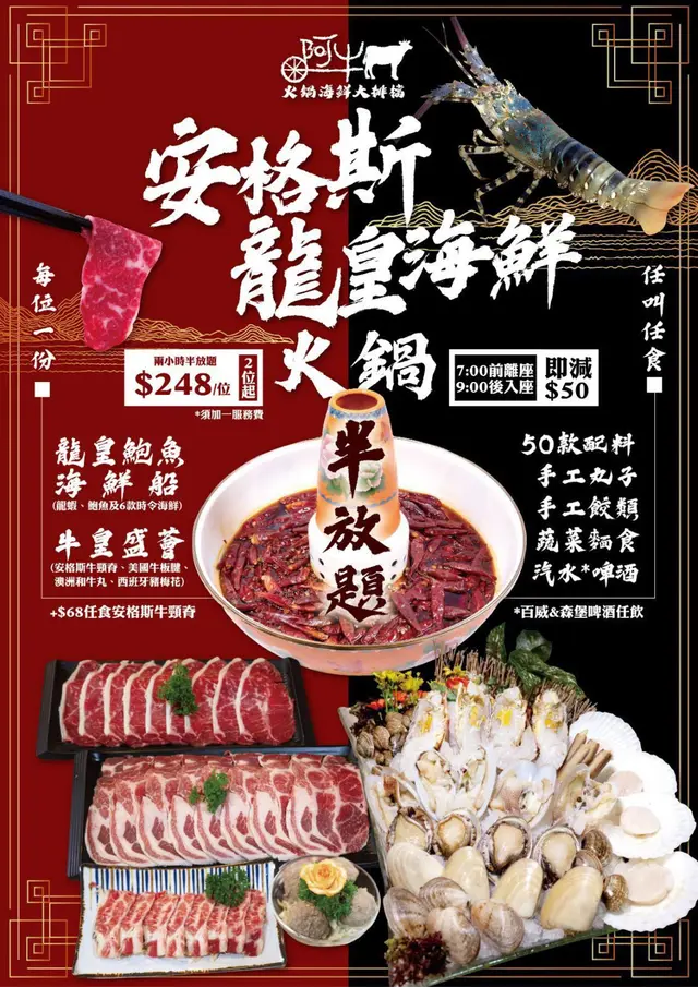 阿牛火鍋海鮮大排檔 (太子) 网址: https://s.openrice.com/QrLS0a9W900 地址: 香港太子大南街6-8號璟璜大廈1樓及3樓 电话: +852 23951188