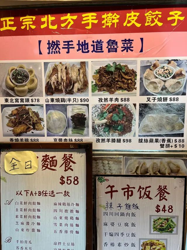 两个人食咗$352,感觉上有d贵,不过除咗个地瓜拔丝外,其他样样都唔错。细份的手抓羊肉,唔韧,少少肥,羊肉味香,每人都有3旧。鲜淮山炒木耳,$78,清爽新鲜,唔系好大碟。茴香鲜肉饺,可放汤、煎或者好似咁样嘅净饺,净饺有10只,馅料真系茴香,几好食,$56。第二款饺子拣咗西红柿鸡蛋饺,都好食,不过都系茴香鲜肉饺香d,可能有肉啦,$52有10粒。拔丝地瓜就真系好麻麻,开头以为d丝系自己拔,但系原来佢已经帮你拔好,地瓜个味都麻麻。