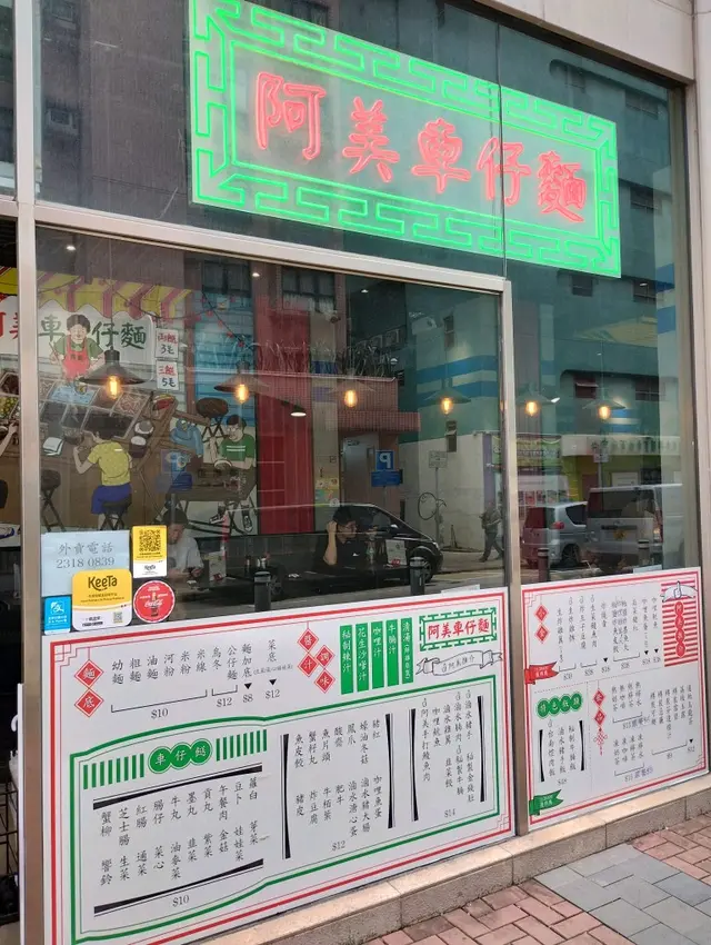 經過大角咀見到這間,“阿美車仔麵餐廳樓底高,有大片玻璃窗可望住街景,牆壁有香港舊車仔麵特色壁畫,獅子山下裝飾,背景播放流行歌曲,令人有份懷念老香港的感覺,座位寬敞乾淨冷氣充足,服務員殷勤招待,多款麵類和車仔餸選擇,湯底係用鮮雞去熬製,完全無任何味精.可以再加花生沙爹醬/秘制辣汁/咖哩汁/牛腩汁自選車仔麵 $82凍檸檬茶 跟餐+ $9油麵蘿蔔菜心蠔油冬菇鹵水豬大腸咖哩魷魚自選車仔麵 $74凍咖啡 跟餐 +$9幼麵蘿蔔豬皮鹵水豬手秘製牛腩秘製金錢肚咖哩魚蛋 6粒 $18韭菜豬紅 $28生炸雞髀$30每一款配料都想食,所以揀咗好多款式,整體味道食材都有驚喜,值得推薦👍查看更多