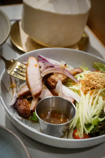 🙋🏻♂️饿底探员去尖沙咀调查呢间泰国菜,餐厅走木系风格,泰国直送食材及私房制酱汁,以新派手法融合于西式菜肴入面,主打泰西fusion菜式,仲有私房泰式粉面,创意手工甜品,特饮同鸡尾酒,可以体验到不一样嘅泰式风情🍗泰咸蛋黄金单骨鸡翼 $78🙋🏻♂️表示单骨鸡翼炸到金黄色,表面以咸蛋黄酱包住,外脆内软,鸡肉嫩滑多汁,食落充满住咸蛋黄酱嘅咸香,香口惹味🦀脆炸软壳蟹米纸卷配牛油果酱 $128🙋🏻♂️表示香滑软糯嘅米纸卷包住脆炸软壳蟹,口感对比强烈,软壳蟹炸得香脆,肉质鲜甜,配上香浓牛油果酱,增添清新气息🍝冬荫功浓汁虎虾意大利面 $148🙋🏻♂️表示以传统泰式冬荫功融合意大利面,配上大虾,青口,鱿鱼等海鲜,面质弹牙,每啖都充满浓郁冬荫功汁,香辣惹味,将泰西料理完美结合🍜清莱咖喱猪颈肉金面 $86🙋🏻♂️表示呢个金面系泰北经典面食,面质爽弹充满蛋香,配上香软爽口嘅猪颈肉,咖喱汤头辛香浓郁,带有浓厚椰香,面头放上脆炸嘅面条增添口感🍋阿闲泰氮气冷泡柠檬茶 $58🙋🏻♂️表示柠檬茶用港式茶底配上西式茶叶,以冷泡方式处理,配上鲜榨柠檬汁,冷泡茶注入氮气形成泡沫,饮落香醇细滑,营造出啤酒般嘅口感,非常特别🍵阿闲泰奶绿 $48🙋🏻♂️表示绿茶同奶形色梦幻嘅渐层,饮落茶味甘香,底层有香甜嘅炼奶,配上经焦糖化嘅香蕉,增添甜蜜气息📈吃货指数😋好味度 9/10🔙返啅度 9/10…查看更多