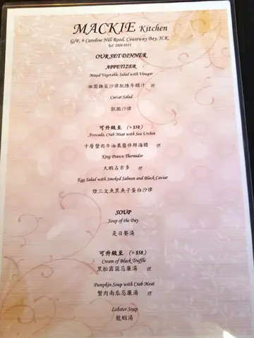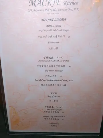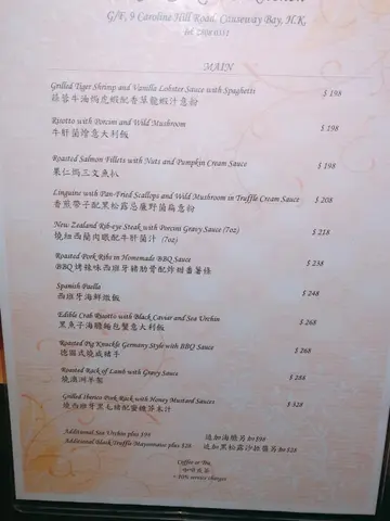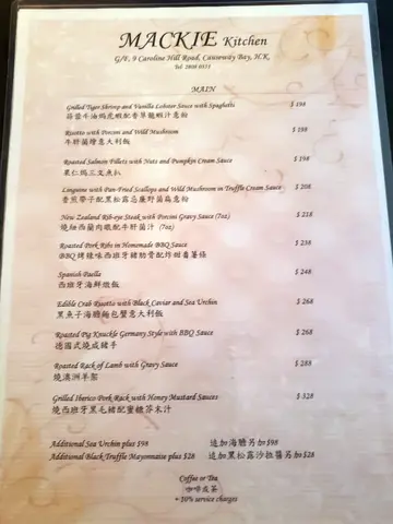 印象中阿麦厨房已在加路连山道䇄立多年,舖面以深啡色为主 ,大半身玻璃窗配以白色纱帘 , 门口位置设有玄关位 ,室内柔和灯光投射在紫色墙身上,感觉甚有旧英伦味道,直觉认为一间可以系同一位置经营了咁多年嘅餐厅应该出品都不错吧,否则老早被淘汰啦,所以今日同朋友路经此地,又刚刚是晚餐时间,我当然要把握机会试一试里间餐厅。我们七时左右入座 ,客人未算太多 ,不过接近八时许 ,餐厅已有八九成满。餐厅供应晚市套餐 :包括前菜、餐汤、主菜及附送一杯品;主菜有十一道,定价介乎$198至$328不等;而前菜及餐汤除有基本选项,亦可加钱升级指定菜式,任君选择。见升级版菜式都几吸引 ,故此便由是日前菜及餐汤加钱转了升级版。烟三文鱼黑鱼子蛋白沙律(加$58 升级)整体味道好夹,烟三文鱼下面全是黑鱼子,不单卖相高贵,配以蛋白及律菜同吃,口感更有层次蟹肉牛油果伴鲜海胆(加$58 升级)海胆非常新鲜,仍留有淡淡海水味,肥美清甜,超好食;下层有很多蟹肉并混入牛油果蓉,味道浓郁,与沙律菜同吃刚好平衡到味道。黑松露菌忌廉汤(跟餐加$48升级 )幸好升级了黑松露菌忌廉汤,入面十分之多野菌碎粒及留有几片体积略大菇菌丰富了汤的质感,另外还有黒松露及忌廉在中,香味浓郁,口感幼滑,钟意饮杂菌汤的人真的不可错过。龙虾汤 (跟餐加$48升级)味道独特,饮落有少少烟熏的香味,不过原来系我错觉,其实餐厅只是在汤中加了一种酒,而非烟熏味 ,亦提升了龙虾汤的味道。烧西班牙黑毛猪配蜜糖芥末汁 $298好欣赏个蜜糖芥末汁, 甜甜地 ,好好味 ,芥未加酒混入蜜糖当中令人产生错觉 ,以为系果浆加蜜糖的味道 ,十分神奇 ,两大块黑毛猪相当厚,烧得刚刚好 ,肉嫩又有咬口。配菜薯仔粒烤的非常可口。蒜蓉牛油虎虾意粉 $188原只虎虾㓥开一半平铺在意粉上,虾肉洁白 咬落爽口 ,带有淡淡蒜蓉牛油味 ,意粉份量颇大 。跟餐的drink list 有十个选项 ,另外餐厅尚有另一独立 drink menue 可供选择,只要补少少钱便转其他饮品。朋友跟餐就叫Twinings 苿莉花绿茶 ,整壶送上 ,好抵饮。我就从独立drink menue 当中拣了杯薄荷咖啡 ,上面的树熊拉花实在太可爱 ,当然要影相留念先 ;咖啡当中早已加了糖 ,不太甜 ,带点淡淡薄荷味 ,非常非常好喝。加路连山道一带畀人既感觉系一个旧楼林立、宁静、休闲的小社区,近十年被慢慢打造成一个饮食集中地。吸引很多富特式小店进注。从阿麦厨房惹大的玻璃窗望出去街外的景物,令人很易忘怀原来一街之隔已经是繁嚣的铜纙湾商业区。若然要求食物质素 ,座得舒服 ,职员服务态度佳 ,阿麦厨房是个不错的选择。