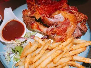 主菜蒜蓉牛油焗虎虾配香草龙虾意粉,虎虾非常大只,用上惹味蒜蓉牛油焗,好开胃!意粉有咬口,加上浓郁龙虾汁,整个配搭好出色!另外德国烧猪手则好大份!足够2-3人享用!猪手经改良,没有传统猪手的咸。外皮好脆,肉难得保持嫩滑!另外薯条要赞,因为比外间的更脆更香口!是我吃过最好食的薯条🍟