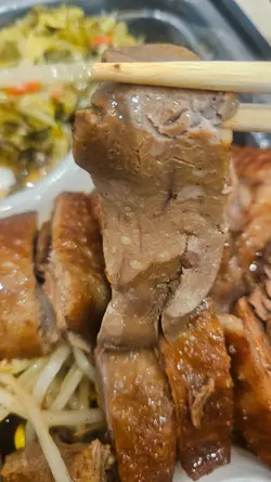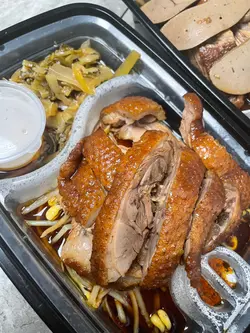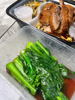 经过门口见到门店挂起的烧鹅和烧鸭都好诱人,特价区几十蚊一份肉也好实惠,点了外卖回家晚上吃。🦆 卤水鹅肉饭鹅肉大大块,差不多有十大块,卤汁的香气完全浸入肉中,卤得咸香入味,展现了卤水功底,入口肉质紧实有嚼劲,皮的部分Q弹不腻,味道香喷喷,还有酸菜和豆芽,捞上香Q米饭,一口接一口停不下来!🌟 招牌鹅三宝除了有鹅肉,还有粉肝,口感绵密细腻,入口即化,卤汁的香气与肝脏的独特风味在口中融合,毫无腥味,好香!鹅肠经过卤制后依然保持著爽脆度! 🥬 清炒芥兰翠绿油亮,口感爽脆!