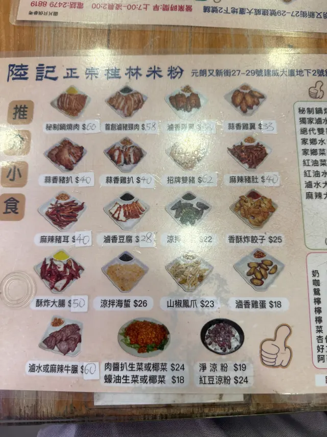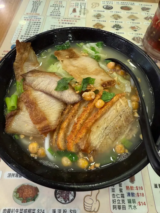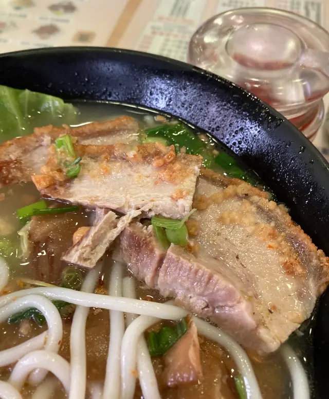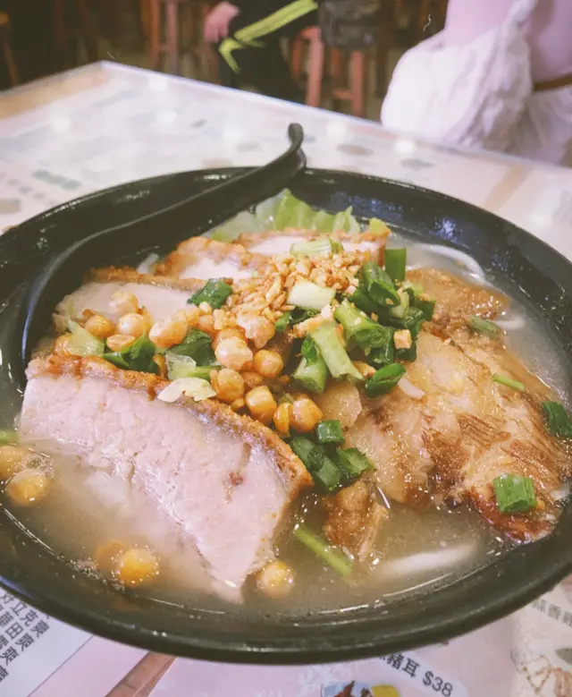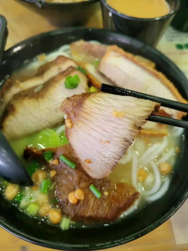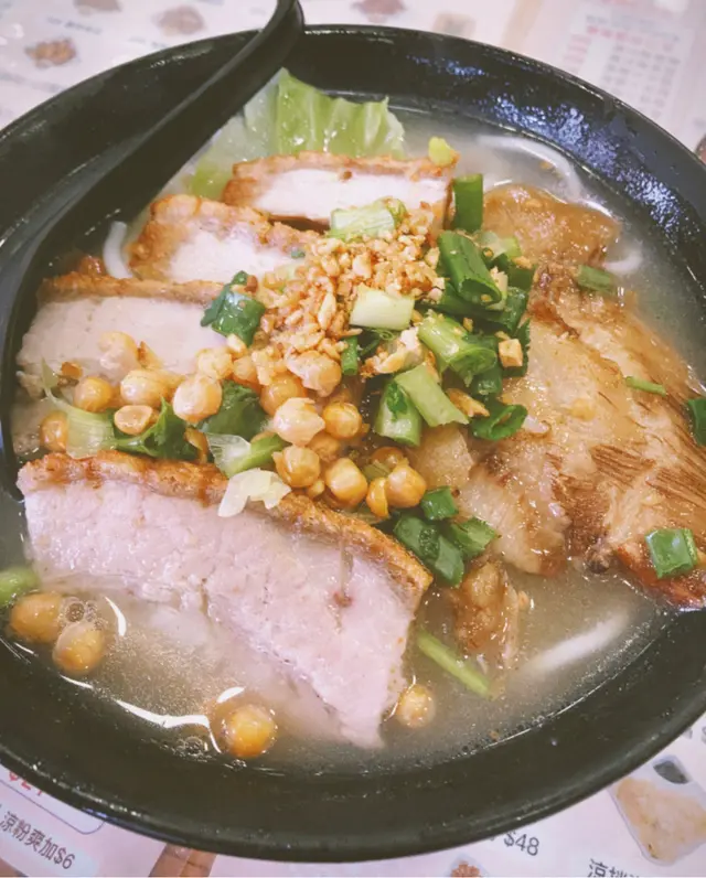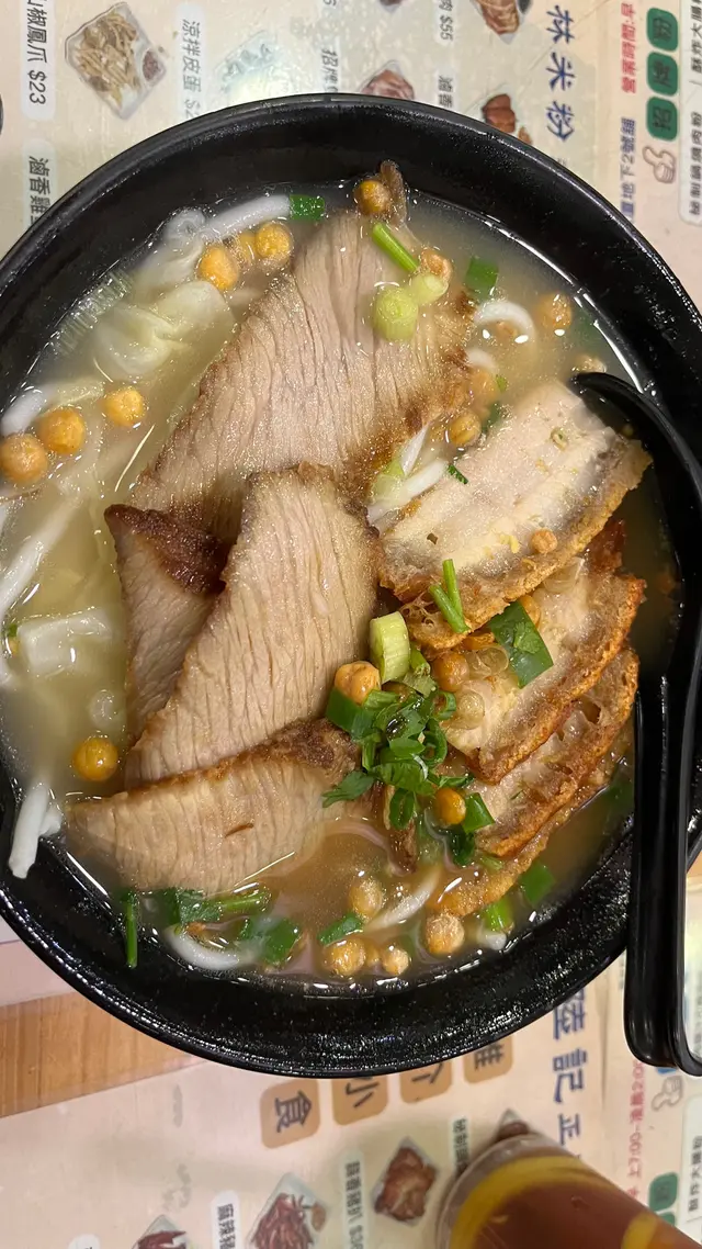 元朗出名美食多🥢每個元朗街坊心目中都有各自的心水飯堂名單📌陸記在元朗紮根多年,在不少街坊心中當然亦榜上有名😇———————————————————————所謂雙豬其實是豬頸肉和鍋燒肉的雙拼🐷各有4片,份量上算是可以👌🏻豬頸肉肉質爽彈,亦有一定厚度👍🏻至於店家一再強調的獨家滷水味道就並未算驚艷😗與一般常見的味道大同小異,恕我未能品嘗到其特別之處😅鍋燒肉外型類似燒味舖的燒肉🐽不過較為薄切🙂豬皮部分十分香脆💥即使浸湯後依然保持脆口😋肉質偏瘦😌不會像燒腩仔般肥膩,因此質感亦會較韌,未夠鬆化🤔桂林米粉與常見的米粉不同,粗身得比米線還要粗🤣但又比米線爽口彈牙😙湯底調味非常清淡,最突出的就是炸蒜的味道😂———————————————————————這碗雙豬米味道比較家常🏠各方面都中規中矩,對我這個區外人來說就未有太多記憶點😅未算太值得跨區到訪。…查看更多