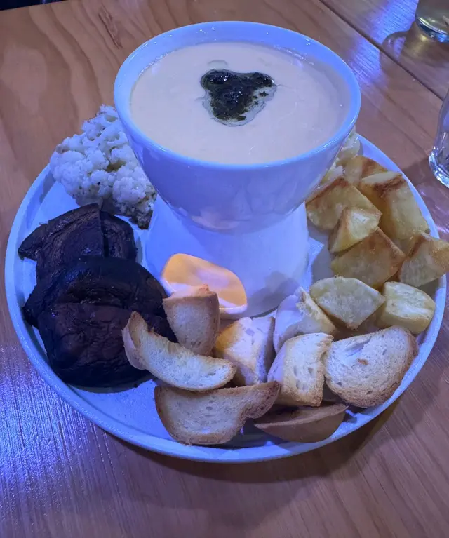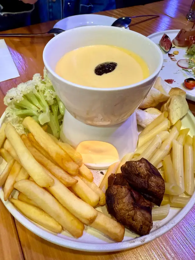 這間店舖坐落在元朗,街道十分熱鬧,在豐年路下車後步行6分鐘就到。店鋪內裝飾雅緻,正逢聖誕佳節,店內可愛的掛飾吸引目光,播放着輕音樂,使人有個好的環境用餐。(素)黑松露芝士火鍋 $198濃郁的芝士配上黑松露的點綴,用小火慢熬,味道很純。提供了烤椰菜花,烤薯仔,長通粉,烤大啡菇,麵包⋯讓你點上芝士進食,味道不錯。瑪格麗塔薄餅🍕(精選帕瑪火腿)$98薄餅邊角位置口感很脆,有火腿和蕃茄仔,火箭菜和芝士的調配,每一口都很香很入味,好吃😋今次的套餐搭配的是蘑菇湯和蒜蓉包,蘑菇湯熬製得很純,入口順滑。蒜蓉包香脆,蒜蓉入味,作為進食主食前的前菜,也是挺好的。隨時有驚喜特飲豆花茶(熱)$48紫色的飲品本身就很少,這杯調製出的顏色很好看,讓人忍不住想試一口,味道酸酸甜甜,易入口,配上檸檬汁,作為店內的飲品自有其的特色~姜🫚茶(熱)$48冬天來一杯暖身真的很合適,養生的必選之項。喝一口全身都暖了~隨元朗媽橫路9號富來花園地下17-18號舖查看更多