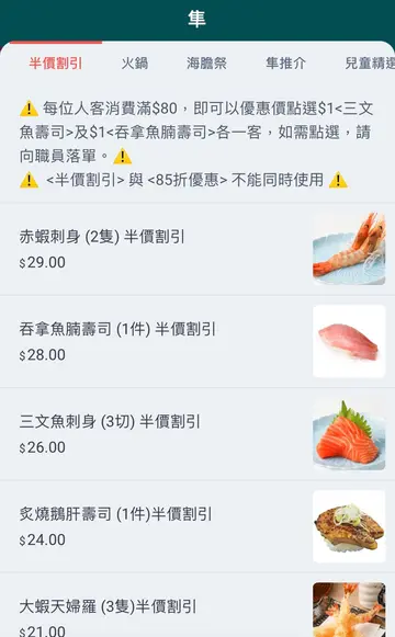原来做紧优惠,超级抵! 每位人客消费满$80,即可以优惠价点选$1<三文鱼寿司>及$1<吞拿鱼腩寿司>各一客,夜晚八点后点餐半价,我地7点几开始食,叫左第一轮之后,过左8点叫第二轮无意间发现!杂锦寿司10件 $108套餐有沙律,三文鱼鲛胶面豉汤,茶碗蒸,超丰富!马刀贝寿司(2件) $28清新爽甜,带著海洋的清新。剑鱼腩寿司(2件) $38剑鱼腩嘅肉质鲜嫩,搭配上寿司饭,中和油脂好满足。帆立贝寿司 (2件) $38鲜甜的帆立贝,生吃更能感受到海味的鲜美。炙烧油甘鱼(2件) $40炙烧手法让鱼肉更加香嫩,搭配油甘鱼的鲜味,令人回味。海胆酱炙烧赤虾寿司(2件) $32海胆酱的香浓,与炙烧赤虾的甜美,口感同味道都好丰富。炙烧左口鱼裙边(2件) $24炙烧手法突显左口鱼的鲜味,裙边更增加了层次感。盐烧三文鱼鲛 $42简单用盐调味已经带出鲜美味道,有丰富嘅骨胶原。玉子吞拿鱼沙律福袋(2件) $28沙律福袋里面包著新鲜的吞拿鱼,清爽中带点香醇。唐扬炸鸡 (半价割引) $18热辣辣外脆内嫩,非常适合分享。三文鱼刺身(3切)(半价割引) $26新鲜的三文鱼刺身,每一切都是柔嫩肥美。赤虾刺身 (2只)(半价割引) $29鲜美的赤虾带有微甜,半价优惠更是物超所值。…查看更多