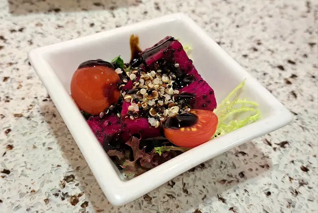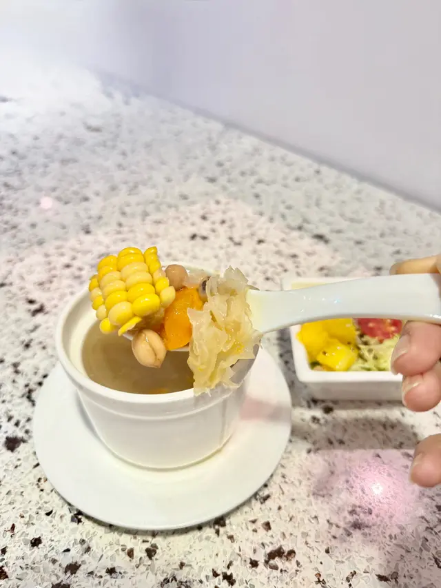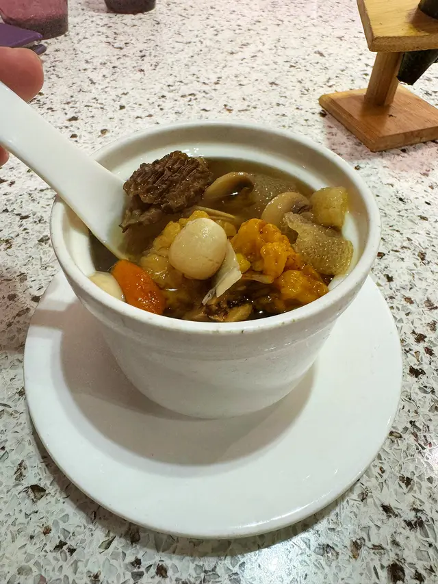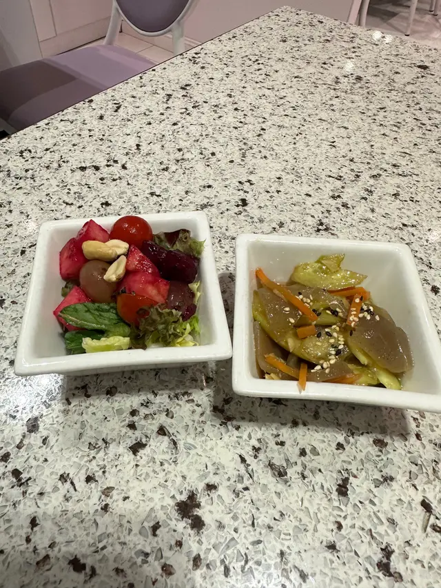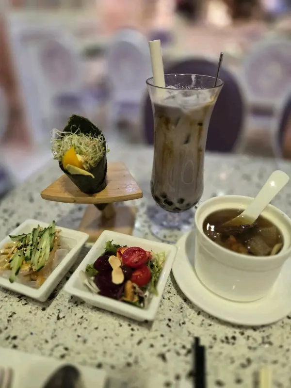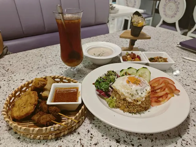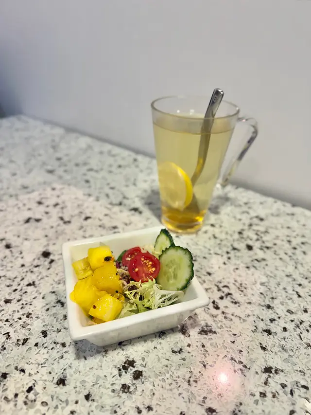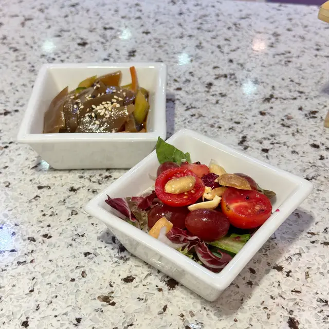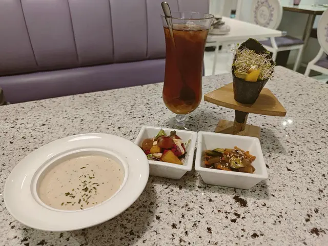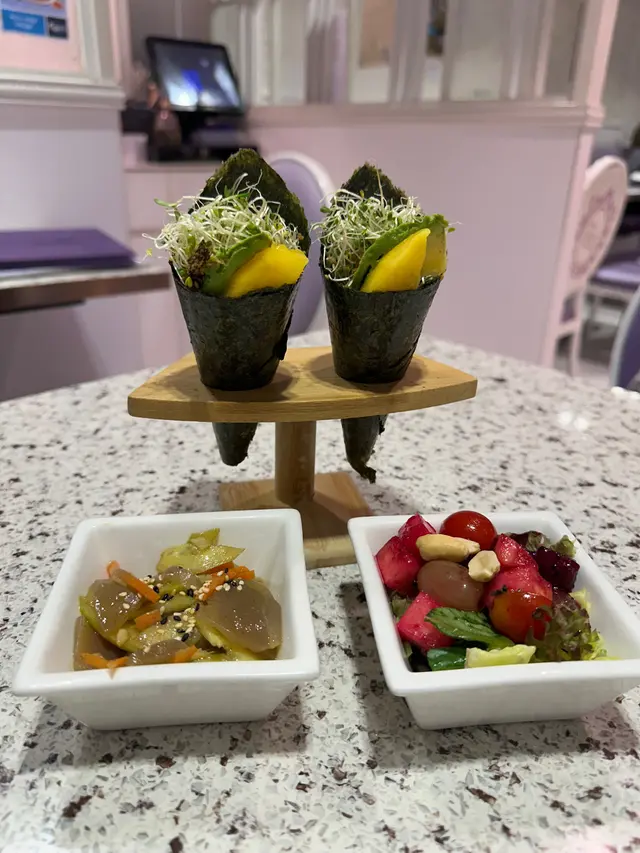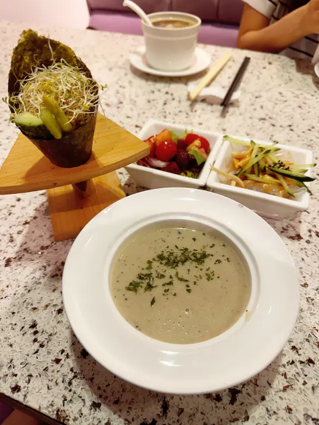 我向來會定期食素菜,今日相約朋友去雅悠素食,位置在尖沙咀非常方便,店主多年推廣健康素食,餐廳以紫色為主,高雅而優靜,食物外型都不似素食我們叫了套餐包中湯或西湯、兩款前菜、手卷、主菜及甜品,我選了中式湯,服務員好殷勤同細心前菜有兩款,鮮果沙律及蒟蒻翠玉瓜鮮果沙律包括火龍果, 提子🍇、車厘子🍒、花生🥜及蔬菜🥬, 清新開胃蒟蒻翠玉瓜、蒟蒻好Q彈而翠玉瓜好爽口,加埋蘿蔔絲條同芝麻增添美味中湯是蟲草花椰子百合黃耳竹笙燉湯🥣材料好豐富,湯好足料,滋潤補身手卷:香芒牛油果苜蓿芽手卷🥑🥭苜蓿代替了米飯,配上芒果牛油果,好Fresh, 紫菜好香脆,店員提醒要盡快食,避免紫菜變淋不夠脆主菜: 椰香冬䕃野菌炒飯伴迷你泰式拼盤炒飯用珍珠米,粒粒分明,好有椰香味,滲入冬䕃香味酸酸辣辣,加入野菌好健康,面頭鋪了太陽蛋,外型好似印尼炒飯迷你泰式拼盤泰式春卷、串燒及泰式蝦餅,沙嗲醬獨特調味,不太桸味道不錯咸香茄子猴頭菇栗子豆腐煲素猴頭菇咬落有菇味,材料滿滿,有茄子、粟子同豆腐,味道同傳統魚香茄子煲冇分別,同樣惹味甜品古法黑芝麻糕 (二件)有濃郁黑芝麻香味,口感軟糯…查看更多