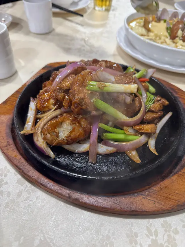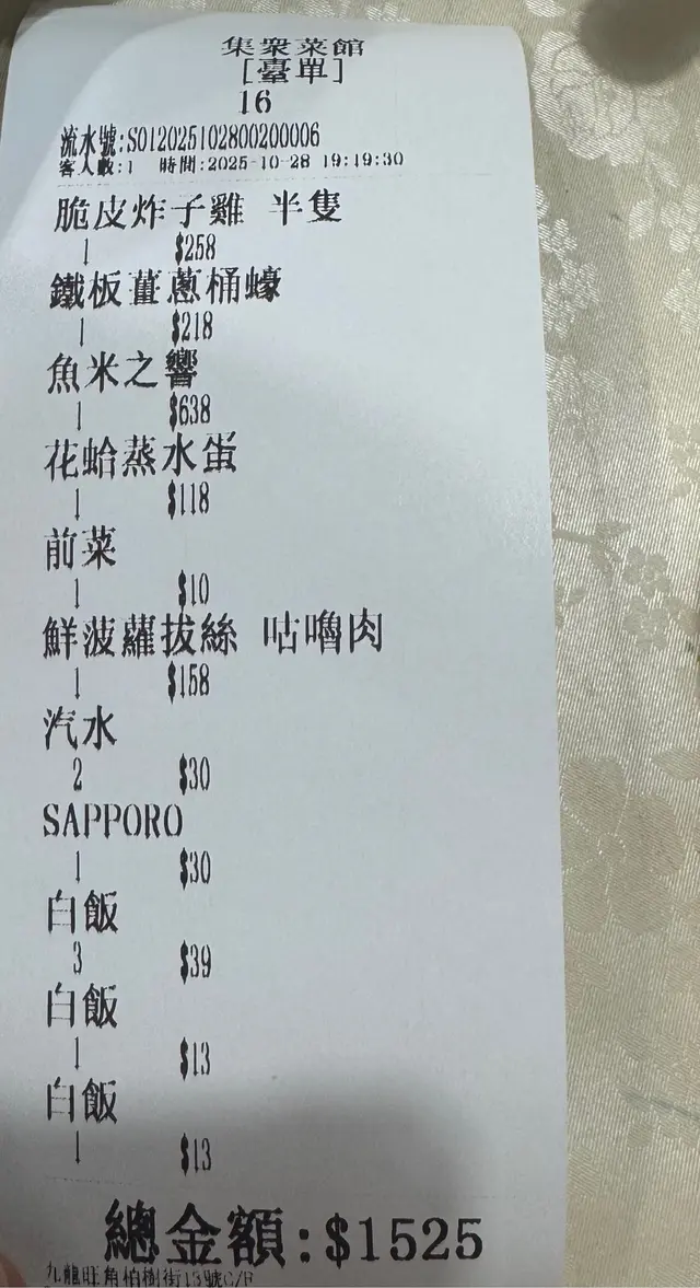 集眾飯聚這間店比想像中受歡迎, 其實地點還好, 沒有很旺, 但生意相當好, 當天還好朋友預先訂位, 因為七時到達時見到有人walk-in但沒有位可以食飯而掃興而回, 所以強烈建議一定要預約, 因為星期一至五都相當多人光顧。謝謝店家安排了大張大桌給我們, 環境還可以, 衛生程度尚可。先吃一碟花生當小食, 相當脆口, 沒有油膉味, 很香, 吃完更見肚餓。其實價錢不算便宜, 比大排檔再貴一點, 我們八人, 每人大約350元左右, 可以的。我覺得他們的咕嚕肉相當好吃, 脆皮是很薄的, 但是是咬到它的存在, 恰到好處, 不會覺得它厚或韌或咬, 而是很適中, 這已經不容易拿捏。而且只有肉, 沒有骨, 食用很方便, 不用吐骨頭, 亦不怕有碎骨。而且味道相當好, 酸甜剛剛好, 很開胃。碟上亦沒有多餘的醬汁, 很專業。吃得出豬的肉質很好, 不會吃到一口肥油, 而是像黑毛豬般是很嫩, 但不油膩的豬肉。這道菜實在相當出色。一百四十元覺得可以接受。我們還點了薑蔥桶蠔, 大約十隻, 八百元, 比較偏貴一點, 但相當好吃。蠔外皮軟軟嫩嫩的, 有咬口, 但不過厚, 有存在感。蠔味相當濃郁而不腥, 而且很大隻, 超滿足, 難得那麼好吃。而且煲內的薑都煮到很夠身, 不會嗆辣, 但是有薑香, 好吃得很。蔥可以再略煮, 讓其更入味和去掉青味。蟶子一隻八十元, 算可以, 因為很大隻, 可能溝通上有誤會, 來到時是豉椒炒, 都好吃, 有吃出蟶子的鮮味, 肉嫩, 不韌, 沒有毀掉食材, 很不錯。有吃出海鮮的咸香, 好吃。我都沒有見過這麼大隻的蟶子。金沙鮮魷都很好吃。最喜歡它的咸蛋黃醬完全充份包著魷魚, 很夠香, 但又不會過咸, 這道菜是必點的。而且這道菜的上菜速度很快, 是第一道上的菜, 還熱騰騰的, 非常出色。可說是我吃過最好吃的金沙鮮魷。魷魚煮得很好, 沒有變韌﹑變橡膠, 好吃。其實不怎麼會吃出魷魚的味道, 因為金沙實在太搶, 但是是相當好吃的。小炒皇都很不錯, 因為它有芋頭, 炸得很脆很香口, 不只是只有韮菜的沈悶版本。除了芋頭外, 腰果我都相當喜歡, 為這道菜加分不少。我們還點了豉油鵝腸, 豉油味不過咸, 鵝腸是有味道的, 不是淡而無味, 鵝腸吃起來亦很嫩, 這道菜都算是可以, 但跟之前的金沙鮮魷和咕嚕肉相比, 是後者比較出色和搶眼的。菜心牛肉: 還可以, 我覺得牛肉可以再薄一點點, 咬起來斷口性會更好。雲耳和菜心是正常發揮。上菜速度還可以, 但脆皮炸大腸等了很久才上桌, 而且魚香茄子也是, 可能生意實在太好, 有漏單, 但都可以接受, 建議自己要核對一下點了的菜, 以免白等。脆皮大腸我覺得有點乾和韌, 即食都不像是即炸的, 吃起來不太夠熱, 而且底下墊菠蘿我個人覺得風馬牛不相及。可以提供更多的甜醬讓我們沾著吃更好, 因為單吃的話偏乾一點。魚香茄子: 最大的優點是熱騰騰, 是燙口的, 很好。但茄子比較是挺身那種版本, 而不是炆到軟糯那種, 喜好因人而異。這版本是加了咸魚的, 如果不喜歡咸魚味道的人可以先跟店員溝通一下看看能否不加咸魚。這道菜是挺適合拌飯的。最後還點了雞, 店家靈活讓我們半隻招牌雞和半隻炸子雞, 還包括了很香脆的炸蝦片和雞什, 挺豐盛的。炸子雞的皮很香脆, 又薄, 沒有甚麼油脂, 好吃。整體上很不錯。雞肉的份量也多, 八人吃都飽飽的。而且用餐環境舒適。…查看更多