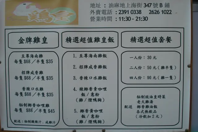 窩8門口等過馬路之際, 遠遠望見呢間小店, 此店位置並唔係上海街, 而係窩打老道果邊, 第2間舖好奇心驅使之下, 走過去研究下有咩好野食一過完條馬路, 未行到門口, 就已經離遠聞到一陣香料味, 心諗一定有好野食店裡面, 好似燒臘檔咁吊住幾隻雞, 放o係店前o既雪櫃側邊寫住口水雞五味雞咸香雞半隻$40, 一隻$70套餐$32非常實惠眼見店內只有一位師傅走來走去, 忙住招呼店內唯一一位客人其實呢間舖, 最多只可以放到兩張小摺檯, 同時招呼6-7位客人由於我o岩o岩食完個茶餐, 又未到晚飯時間, 實在無辦法食得落半隻雞或者一個套餐雞, 只好留番下次再幫襯除左雞之外, 其實門口仲放左一煲野, 上面寫住龍眼冰 補腎(泰式)熱$4 凍$6食唔到雞, 就梗係要執死雞, 點都買番D野黎試下我買左杯凍o既龍眼水o既熱力o岩o岩好將杯裡面所有冰粒溶化飲得出, 係用真正龍眼乾煲, 而唔係用罐頭龍眼味道好清甜, 我認為一粒糖都冇落, 就算有, 都只係好少量夏天飲, 真係一流下次再黎試雞, 一定飲多杯…查看更多