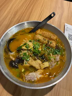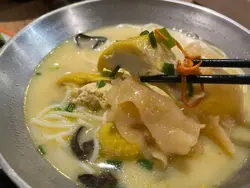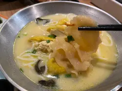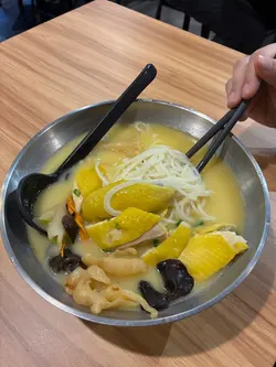 臭屁熊接收工,顺便喺附近食埋晚饭,好耐冇食鸡米,又系去观塘骆驼漆大厦揾食!今日都比较肚饿,同臭屁熊一人嗌咗个面仲嗌埋小食,都系$200有找,几抵食首先一定要嗌嘅梗系佢哋嘅招牌花胶鸡汤米线,汤底清甜唔口渴,鸡件份量唔少,肉质嫩滑,花胶都有两三旧,仲有其他配菜云耳同虫草花,米线偏烟靭另一款嗌咗佢哋嘅期间限定,酸菜肥牛春卷米线,汤底辣辣地小酸,几开胃惹味,肥牛份量唔少,春卷两条,仲有其他配菜豆卜酸菜云耳另外叫咗悍匪鸡翼,一份四只,表皮炸得脆卜卜,表现表面有胡椒孜然粉,味道唔错仲嗌咗臭屁熊嘅至爱,薯条配黑松露酱,劲大盘薯条,偏幼身,新鲜炸起热辣辣,正,食到臭屁熊停唔到口…查看更多