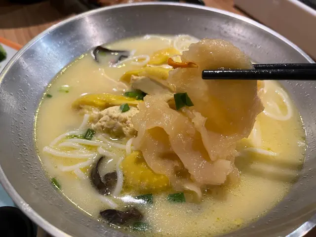 臭屁熊接收工,順便喺附近食埋晚飯,好耐冇食雞米,又係去觀塘駱駝漆大廈搵食!今日都比較肚餓,同臭屁熊一人嗌咗個麵仲嗌埋小食,都係$200有找,幾抵食首先一定要嗌嘅梗係佢哋嘅招牌花膠雞湯米線,湯底清甜唔口渴,雞件份量唔少,肉質嫩滑,花膠都有兩三舊,仲有其他配菜雲耳同蟲草花,米線偏煙靭另一款嗌咗佢哋嘅期間限定,酸菜肥牛春卷米線,湯底辣辣地小酸,幾開胃惹味,肥牛份量唔少,春卷兩條,仲有其他配菜豆卜酸菜雲耳另外叫咗悍匪雞翼,一份四隻,表皮炸得脆卜卜,表現表面有胡椒孜然粉,味道唔錯仲嗌咗臭屁熊嘅至愛,薯條配黑松露醬,勁大盤薯條,偏幼身,新鮮炸起熱辣辣,正,食到臭屁熊停唔到口…查看更多
