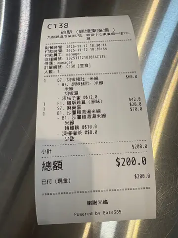 喺观塘见过有几间「鸡駅」分店,今次同朋友去咗东广场试吓。呢度除咗交通方便,环境亦都卫生。价钱合理,不用收加一。沙姜鸡浓汤米线($52)转鸡髀(+$10)呢度米线嘅份量都唔小,沙姜鸡分开上,鸡件嫩滑。胡椒猪肚米线($48)汤底香浓,带有胡椒的香辣味,好暖身。鸡駅鸡翼(原味)($42)香脆热辣辣嘅外皮,嫩滑有肉汁的鸡肉,整体不错。麻药蛋($28)冻柚子蜜(跟餐+$12)冻柠茶(跟餐+$8)鸡駅花胶鸡米线专门店 (观塘)观塘成业街7号东广场1楼116号舖