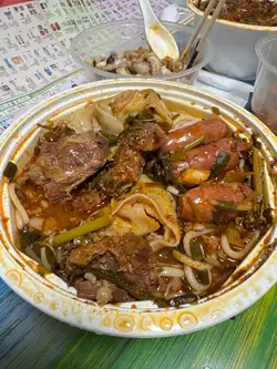 牛腩小锅米线(小酸辣)配料:芽菜、酸菜、韮菜、葱、芫茜追加配料:云吞、台湾肠牛腩系另一款人气之选,牛腩卤得入味又软腍,带少少牛香油润感,配埋酸辣汤底又唔腻。加嘅云吞皮薄馅多,台湾肠香气浓郁、爽弹惹味,为整碗米线加分不少。