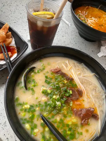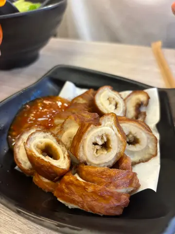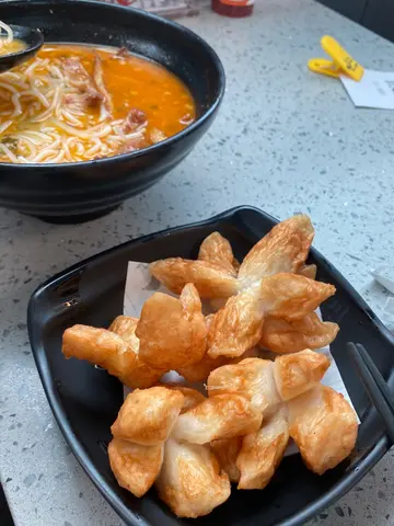 终于食到屯门名物!午市来都要等5分钟啊,不过出菜真系颇快鱼汤薯粉+麻辣牛𦟌鱼汤鱼味不重,但系都有淡淡鲜味嘅,系舒服嘅味道,不过相对酸辣猪排汤底就相对冇咁有特色🤣 但最钟意系麻辣牛𦟌!!超嫩份量都多!另外薯粉唔太配汤汁,下次都系乖乖食米线🫡另外叫咗炸花枝丸~都几好香但好油啊啊啊… 冇特别调味嘅,但可以系枱头攞泰式酸辣酱,不过唔钟意肥腻嘢嘅就唔好叫啦🙂↕️🙏🏻