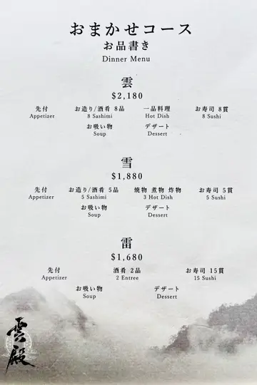 ### 前菜1. **烧银杏** 香烤的银杏,外焦里嫩,散发着浓郁的坚果香气,口感酥脆。2. **煮黑贝** 煮至刚刚熟透的黑贝,鲜嫩多汁,搭配清淡的调味,保留了海鲜的原味。3. **芝麻豆腐** 细腻的芝麻豆腐,口感滑顺,浓郁的芝麻香味与豆腐的清香相得益彰。4. **鸡肝酱鳕鱼片** 鸡肝酱的浓郁与鳕鱼的鲜美相结合,层次丰富,适合搭配面包或饼干享用。### 刺身1. **神奈川针鱼** 新鲜的针鱼刺身,肉质细腻,清爽的口感让人回味无穷。2. **北海道𫚕鱼** 餐桌上的经典,北海道𫚕鱼的油脂丰富,入口即化,鲜美无比。3. **喷火湾吞拿鱼腩** 吞拿鱼腩的厚切,鲜美多汁,搭配少许酱油,口感极佳。4. **北海道香箱蚧** 甜美的香箱蟹,肉质鲜嫩,带有微微的海水味,令人垂涎。### 熟食1. **烧物 甘鲷** 烤制的甘鲷,外皮香脆,鱼肉鲜嫩,配以特制酱汁,更加美味。2. **煮物 蚧黄馒头** 细腻的蚧肉与软糯的馒头结合,酱汁浓郁,口感层次丰富。3. **扬物 花胶天妇罗** 花胶炸至金黄酥脆,外壳酥脆,内里鲜嫩,口感独特。### 寿司 🍣1. **甜虾** 鲜甜的虾肉,口感滑嫩,搭配少许酱油,值得细细品味。2. **银盛野生三文鱼** 选用新鲜的野生三文鱼,肉质鲜嫩,油脂丰富,味道鲜美。3. **北海道海胆** 鲜美的海胆,口感滑腻,带有独特的海洋气息,是寿司中的奢华之选。…查看更多