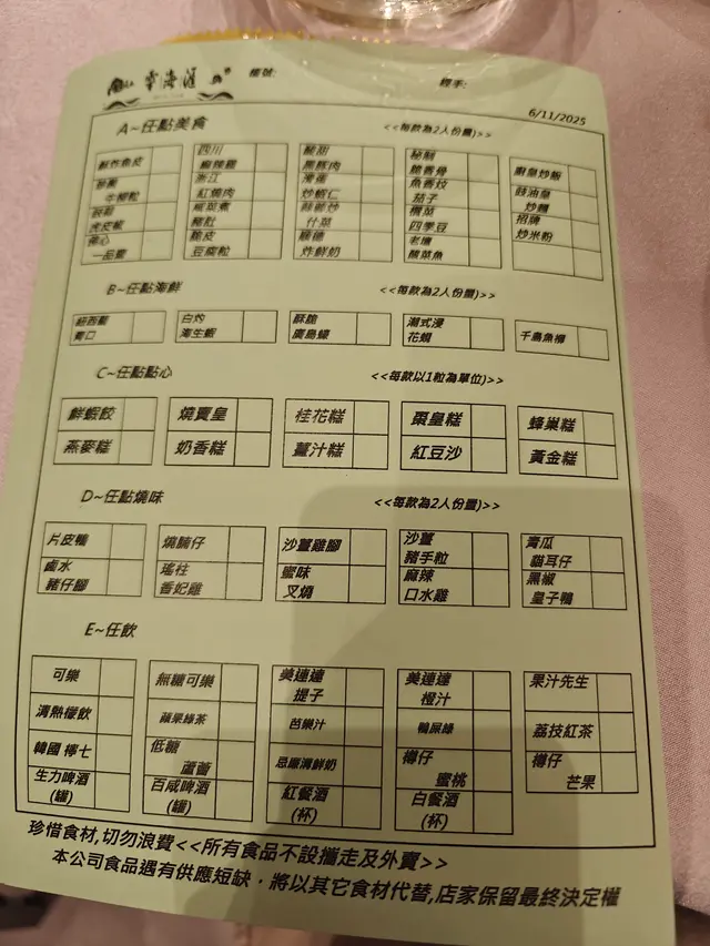 開瓶費:FREE南昌一個屋邨商場有間裝修靚仔又新淨光猛嘅酒樓,閒日人流不多,所以上菜都算快食物種未算多,一張紙睇晒,飲品都滿足到多數人,紅白酒任飲白酒係意大利Soave,清新甜美👍套餐送茄汁大蝦同炆鮑魚配花菇蟲草花燉湯非常清甜足料,大量菇菌,油份超輕微片皮鴨上咗三件,不過放題質素都係乾同凍燒味選擇多,燒腩仔一流👍叉燒都唔錯,偏鹹少少潮式浸花甲我以為係豉油+蒜蓉+辣椒+芫荽,原來係酸菜湯浸😅甜酸黑豚肉出色