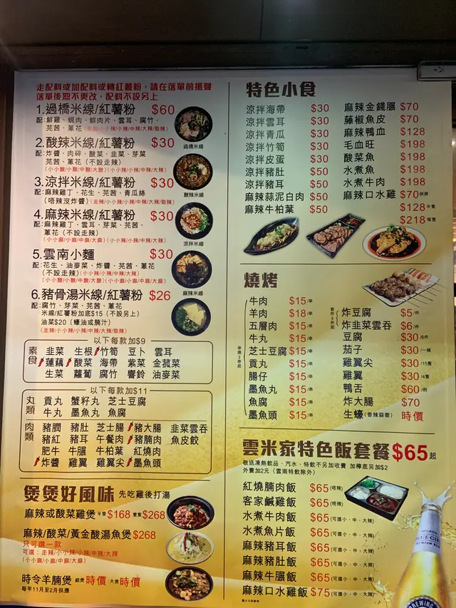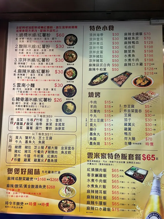 串燒米線乜都有 cathiecheung等级42024-07-04318 浏览 关注 雲米家就在荃灣千色廣場後面巷子,是一家以過橋米線為招牌菜的餐廳。過橋米線首先是他們的過橋米線,湯頭清澈鮮美,米線Q彈有嚼勁,搭配各種新鮮食材,入口鮮甜可口。麻辣金錢𦟌麻辣金錢𦟌是我最喜歡的一道菜,辣味十足,配上香氣四溢的蔬菜,吃起來非常開胃。炸豆腐炸豆腐外酥內嫩,口感極佳,搭配特製的醬料更是美味。串燒串燒方面,他們的牛肉串、羊肉串、五層肉串以及墨魚頭串都烤得恰到好處,香嫩多汁,香氣四溢。每一口都讓人回味無窮,無法忘懷。…查看更多+ 7以上食记乃用户个人意见 , 并不代表OpenRice之观点。赞好分享串燒米線乜都有 雲米家 https://s.openrice.com/QrLT04AvK00检举 张贴 评分4味道4环境5服务4卫生5抵食用餐途径堂食