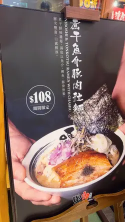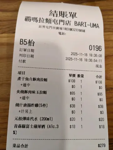 最近成日都食中西餐,想转转口味食拉面,就叫左朋友黎霸吗拉面食晚餐🍜。地点方便,气氛放松,最重要系今晚想食返d重口味同暖胃既嘢,拉面就最岩啦!.辛辣炙烧豚肉味玉 $98 拉面一大碗上枱已经好有惊喜,汤底带辣但吾呛,香气有少少炙烧香同层次既辛味;面条弹牙够爽;笋切得适中,吸汤又有清脆口感;炙烧豚肉肥瘦相间,炙过表面带微焦香,油脂同瘦肉既比例好平衡,每啖都夹到肉既嫩同油香;味玉半熟溏心,酱香渗到蛋白入面,整体好满足又有份量👍🔥.鸡叉烧辛辣鸡白汤拉面 $95鸡白汤浓郁滑润,辛味温和地提升层次但吾会盖过鸡味;鸡叉烧系圆形既,几厚身,切开有肉汁,口感厚实但嫩滑;汤入面仲有木耳,带d爽脆,跟住吸d浓汤,好有口感对比,整碗食落去系温暖又有惊喜既组合🍗🌶️.羽根饺子 $35 日式饺子底部煎到金黄酥脆,形成一层轻薄如羽毛既缕空薄饼,入口第一口系脆既声音,跟住就系饺子内馅既多汁同香味,皮身同羽根既层次分明,口感好有特色,配埋少少醋同辣粉更提味🥟✨.沙拉唐扬鸡 $38大大粒既唐扬鸡球,外皮炸得脆身但吾油腻,一咬就爆汁,鸡肉嫩滑有汁,调味吾会太重,配搭埋沙律酱,好creamy🍗.Zero 可乐 $15 无糖既可乐带紧爽快既气泡感,cola味够,饮落去可以好好清走汤既油腻,特别系食完辛辣或者炸物之后,喉头即刻清爽返黎🥤❄️…查看更多
