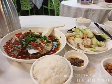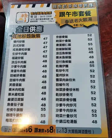 有工作在身外访三圣邨,由于到午饭时间,先填饱肚子。不选择,随缘行到青山湾美食厨房,坐低还未点餐,先送上滋补的例汤,真窝心。看看午餐牌,好容易就选择了银鱼云耳蒸腩片饭($48)饭同𩠌都够热,银鱼仔很香口,腩片非常滑溜!我加$8.00添了一大杯冻斋啡,够浓而且冇酸味,高质而且好抵饮!同事则选了蒸鲩鱼饭,我试了一口,非常新鲜美味,蒸鱼的时间刚刚好。每碟饭都有适量的菜,一个套餐很完整了原来三圣除了海鲜出名,也有快靓正抵的选择👍…查看更多