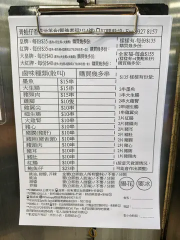 青蛙仔由旺角卤味名店肥姐小食店的媳妇主理,将港式街头风味带到观塘和荃湾。卤味当然是必点之选,墨鱼鲜嫩,生肠爽脆,个人最爱的猪心弹牙浓郁。配上甜酱和芥辣酱更加惹味。Froggy, run by the daughter-in-law of the famous Fei Jie, brings authentic street food including marinated offal. Personal favorite is pig heart, chewy and flavorful. Paired with sweet sauce and mustard, the taste is even better.…ดูเพิ่มเติม