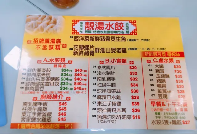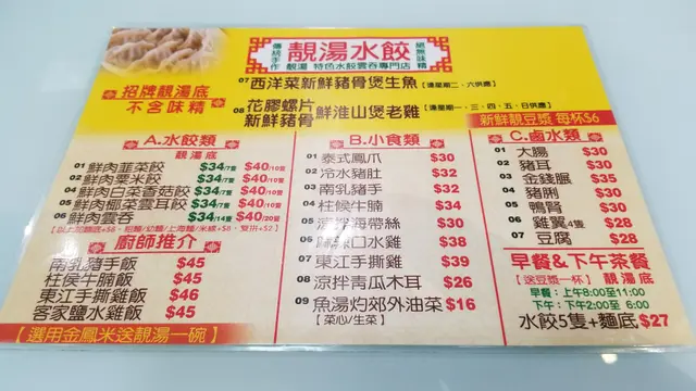 曾看過友人稱讚這間小店的文章,引起了我前往一試的興趣,於是找了一晚,兩夫妻一起前往幫襯。 店名「靚湯水餃」,顧名思義,賣點是靚湯和水餃,兩者相輔相成,作為這小店的招牌食品。 這兒的水餃包括「鮮肉韮菜餃」、「鮮肉粟米餃」、「鮮肉白菜香菇餃」和「鮮肉椰菜雲耳餃」四款,四款水餃都是 $33七隻,$39十隻,價錢都幾相宜。我吃的是「鮮肉白菜香菇餃」,餃子皮不算很薄,但菜甜肉鮮味道好,水準頗佳。 相比起這兒的水餃,我覺得這兒的不含味精靚湯更加重要和吸引,可說是這小店的靈魂。這兒的不含味精靚湯底共有兩款,分別是「野葛菜新鮮豬骨煲生魚」和「花膠螺片新鮮豬骨鮮淮山煲老雞」。前者逢星期一、三、五、日供應,後者則逢星期二、四、六供應。而我這天喝到的,並非更加喜歡的後者,而是前者。這湯底的確是真材實料的,味道清甜,完全喝不到師傅的痕跡,吃著水餃,喝著靚湯,讓我少有地到最後把湯全部喝光。 牛舌、豬脷、鴨舌都是我的所愛,見這兒的鹵水小食中有「鹵水豬脷」($28),也有點來一試。薄切的豬脷,柔嫩度及格,但還可更佳,鹵水汁味道挺好,伴以青翠的蔥花,中看,也中吃。都說大角咀多好吃的小店,這間「靚湯水餃」正是其中之一。查看更多