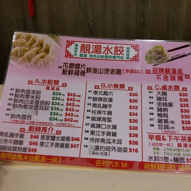 今晚口淡淡,又唔想食太飽,睇完雜誌介紹去咗大角咀靚湯水餃(第三位)。。。完全係一個騙局⋯⋯湯餃嘅皮太厚,餡料未算突出。湯底白色湯面冇咩油,感覺健康。雖然標榜冇味精,估唔到係完全冇味。是日椰菜雲耳餃。。。。椰菜正常爽口,但肉餡淡而無味,同埋咬落係散嘅。感覺唔太新鮮。菜有菜味。肉就食唔到有味。菜比例太多,餡料太少。餃子皮粉漿太多,烹調時間過長。餐廳環境乾淨整潔。可惜味道未能到達水平。。。。。。。。。查看更多