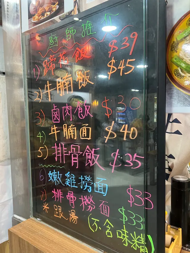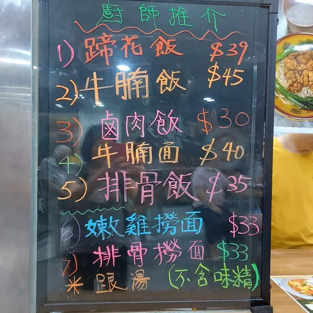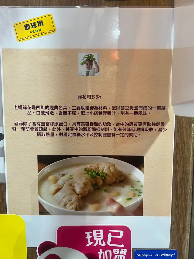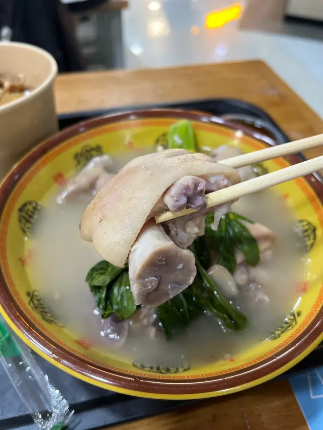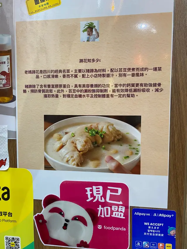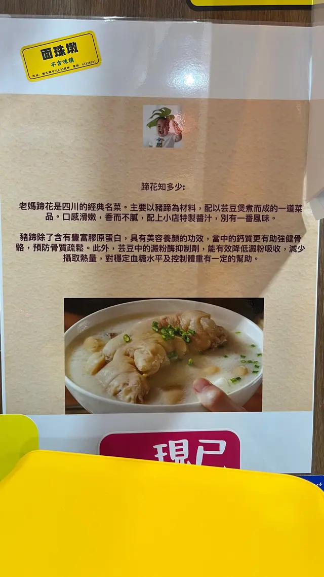 西九龍中心咁多嘢食,今晚食咩好?見有朋友介紹過八樓有間高質蹄花湯,就走嚟望下🤔店名叫面珠墩,由於美食廣場店舖太多,小店真係唔易搵,行到較後嘅位置先至見到。見前面食客點咗招牌蹄花湯,真係幾吸引,仲可以配飯配菜加飲品,成個套餐都係六十幾蚊,真係平過北上。⭐牛腩飯朋友話佢想食牛腩飯,一碗牛腩飯有成五、六件牛腩,仲有一粒牛丸同一隻鹵水蛋,加上涼拌土豆絲同兩條青菜拌下碟,顏色好睇又營養均衡。牛腩炆得很入味,有筋有肉半肥瘦,咬落牛脂甘香勁正喎😋⭐沙薑豬手飯自己就點就沙薑豬手飯,豬手係炆到軟腍嗰種,口感就係滿滿骨膠原嘅感覺,仲有淡淡嘅沙薑香味。豬手清理得好乾淨,無雜毛無異味,真係化咗唔少功夫😋一碗有四大件豬手,食完啲豬手都爆咗嚕。⭐蹄花湯附上一碗例湯,其實等同佢哋嘅招牌蹄花湯,不過呢度就無蹄花,但入面都有雲豆㗎,雲豆蹄花湯就係傳統嘅美味🤤雲豆綿軟入味,湯汁香濃有黏口嘅感覺,哈哈,骨膠原呀~⭐炸魚薯條只係食飯覺得有啲平淡,於是加多咗份小食炸魚薯條,大大份炸魚薯條都係35蚊,下午茶時段仲送嘢飲添😳魚肉非常嫩滑,炸漿香脆,咬落鮮味唔油膩,估唔到小店都用上咁靚嘅魚肉去做炸魚薯條😍⭐原味烏龍茶 & ⭐白桃烏龍茶加六蚊可以有一罐原片茶葉嘅無糖冷泡茶,有原味同白桃烏龍兩款口味揀,喺台灣出品寫繁睇字㗎👍好好味又價錢貼地,仲份量十足添,真係抵食到喊出嚟😆…查看更多
