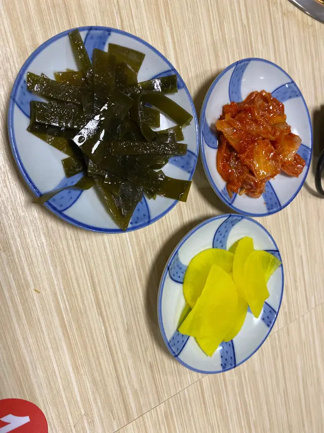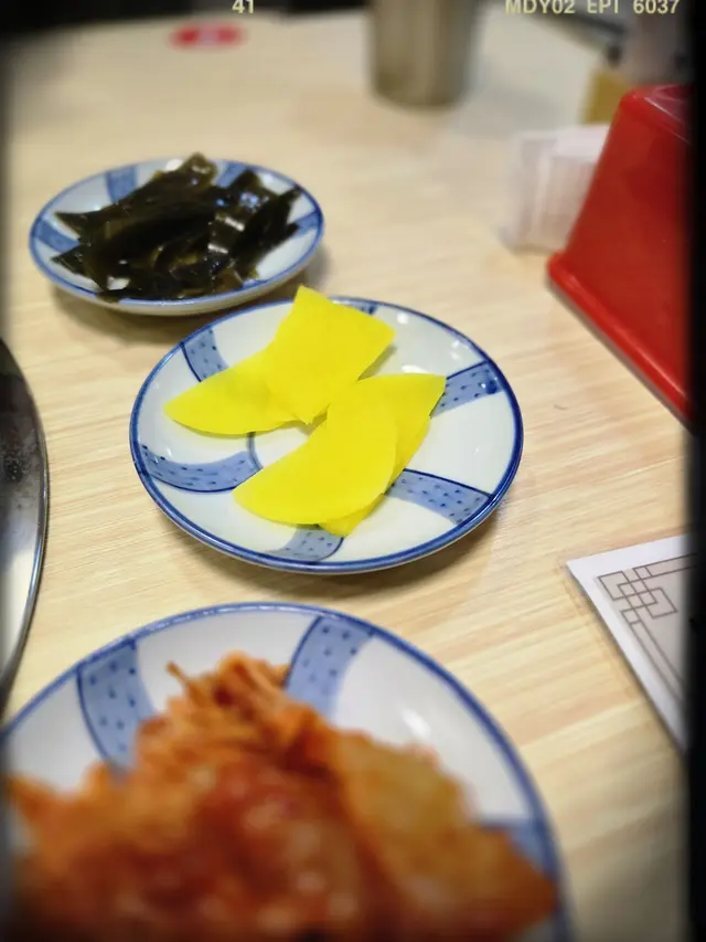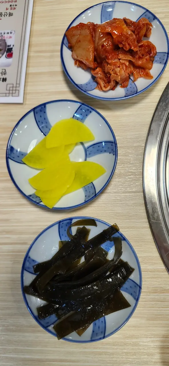 !二人被安排入座最中間嘅四人枱。餐桌上擺有齊備嘅自用餐具、乾濕紙巾、廚具等,另外每二人都有個爐頭,衛生企理。電子落單流程方便快捷。底面兩頁餐牌中韓對照,並附有彩圖參考,簡單易明。點好菜,姐姐仔迅即呈上無限添加嘅三款韓式前菜,當中個人最愛清新爽脆嘅蘿蔔片。同事口味不同,較為欣賞厚潤嘅海帶同酸辣嘅泡菜。