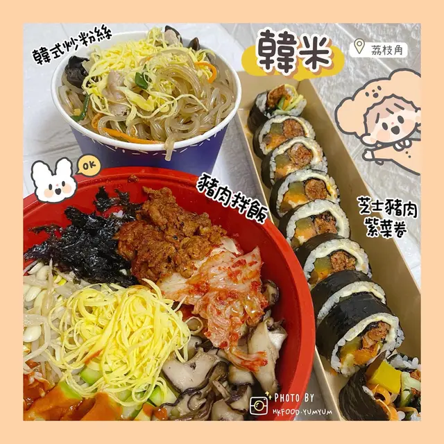 韓式外賣小食店🇰🇷韓米ʕ๑'ㅅ'๑ʔ‧˚ ꔛ ꔛ ꔛ ꔛ ꔛ ꔛ ꔛ ꔛ ꔛ鄰近荔枝角地鐵站✨香港工業中心呢韓式小食店🇰🇷主打各類飯卷、韓式拌飯🍙收工時間都見唔少人買外賣🥡▪️芝士豬肉紫菜卷💲5️⃣8️⃣咁多款嘢食入面最推介呢款🌟飯卷包得幾實 唔會一夾就散出嚟❤️豬肉份量唔算好多 但仲包住咗黃蘿蔔. 青瓜. 蛋絲. 紅蘿蔔絲 芝士等配料但可能因為太多配料了 所以芝士味就冇話太出(˶ฅωฅ˵)另外因為加咗黃蘿蔔酸酸甜甜 中和左豬肉嘅辣味 淨係有少少辣✨食落都係好滿足嘅一個飯卷ჱ̒⸝⸝•̀֊•́⸝⸝)‪▪️韓式炒粉絲晚市套餐💲7️⃣8️⃣粉絲食落好彈牙 都幾重黑椒味(ˆ꜆ . ̫ . ).ᐟ.ᐟ有洋蔥.木耳.蛋絲.蘿蔔絲等等配料💛睇落好似好細盒 但係其實份量都幾多!跟餐配咗兩件無骨雞.韓式魚糕湯.韓式小食同汽水飲品〰️無骨雞點左甜辣醬 酸酸地小辣而炸粉唔太厚 肉質都唔鞋的( ´͈ ᵕ `͈ )♡▫️豬肉拌飯💲5️⃣8️⃣色彩繽紛又豐富嘅韓式拌飯✨入面有翠玉瓜.蛋絲.泡菜.芽菜做配料食落口感好豐富 豬肉有少少辣度食完會辣到微微出汗〰️但都可以接受 整體上都係一個好豐富嘅配搭!—————————₊♡⁺⋆ ʕ๑'ꇴ'๑ʔ♥︎ —————————📍韓米荔枝角青山道489-491號香港工業中心A座地下A2F號舖查看更多