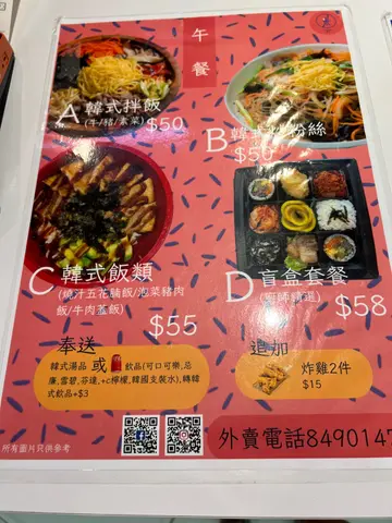 系东广场嘅一间韩国嘢食,只做外卖~咁呢间第一次呢度外卖lunch~个样睇落都都平靓正嘅咁就$50食到个lunch~ 就买咗一个猪肉泡菜拌饭👍🏻👍🏻仲有个嘢饮包埋都OK,其实东广场嚟我公司呢就有少少距离嘅,我拎到返公司呢咁佢都仲暖暖地,佢就有翠玉瓜、泡菜、有个辣辣地嘅猪肉、有紫菜、有芽菜、冬菇切片同埋好多蛋丝都好齐全啊啲料咁味道系OK好食嘅以$50呢个价嚟讲👍🏻👍🏻各样𩠌都好味嘅系泡菜你就真系唔好预系好好食𠮶只啦,但系都唔差嘅:)