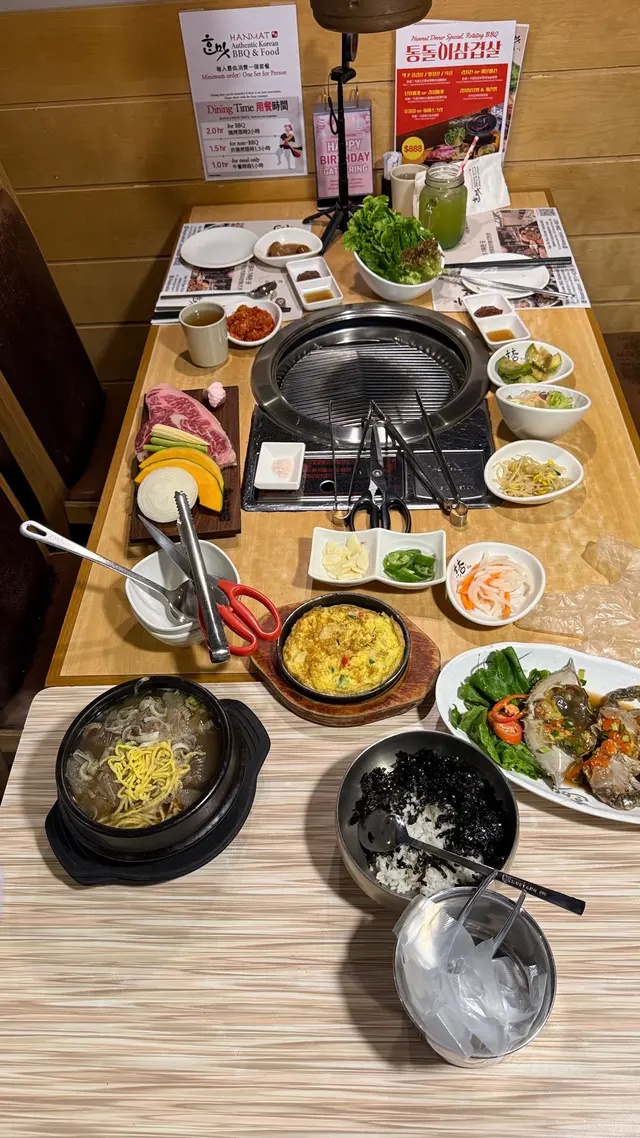 尖東超人氣爆紅韓式美食🍽️ 肉眼 + 西冷一次滿足牛迷味蕾 😋爆膏醬油蟹打卡必食邪惡之選 🦀 烤韓牛腸近期人氣菜 超高人氣嘅尖東「韓脈」!餐廳環境真係勁韓式,每個角落都feel到韓國氛圍~而且場地又闊落又舒服,唔怪得咁多韓國人都來食,仲有岩晒鍾意嚟打卡的你,絕對係最近熱門韓式餐廳之選!🍽️烤爐嘅秋風非常好,絕對唔會令你有油煙味👍🏻👍🏻餐廳選用高質食材,服務貼心又有水準,成個用餐體驗very good!今次我要同大家分享下今晚嘅招牌美食:✨ 首先係超豐富前菜,居然有醃製鵪鶉蛋!味道好有層次,仲有我最愛嘅芽菜同酸蘿蔔,韓式風味十足。🔥 烤韓牛腸,最近喺香港超流行~🥩 重點推介:雙拼牛肉(肉眼150g + 西冷150g)肉眼鮮嫩多汁,油花平均,食落超香口!西冷牛味濃厚、肉質結實,有咬口啱晒肉迷!兩款牛肉一次過滿足你唔同口感追求,真係食到停唔到口。🦀 超爆膏醬油蟹$250,蟹膏好濃郁,配埋牛油飯一齊食,非常邪惡又滿足,鮮味瞬間升級!🥚 韓式雞蛋餅,份量足夠又香脆,色香味俱全~🍲 韓式牛肋骨湯,服務員幫忙剪開,足料又入味,啖啖都係牛肋肉,湯底超濃郁!🥤 飲品選擇超多:推介Blue Lemon Ade、Lemon Ade、Kiwi Ade同Grapefruit Ade,全部都好清爽,食完一啲都唔膩!餐廳除咗BBQ、醬油蟹、海鮮,仲有韓式炸雞、傳統小炒、豬手、火鍋、湯、石鍋飯麵等超多元化選擇~每個胃口都滿足!不論係同朋友聚餐,情侶約會,定一家大細,韓脈都係尖東聚會食韓餐首選!有興趣一定要book位試下啦!…查看更多