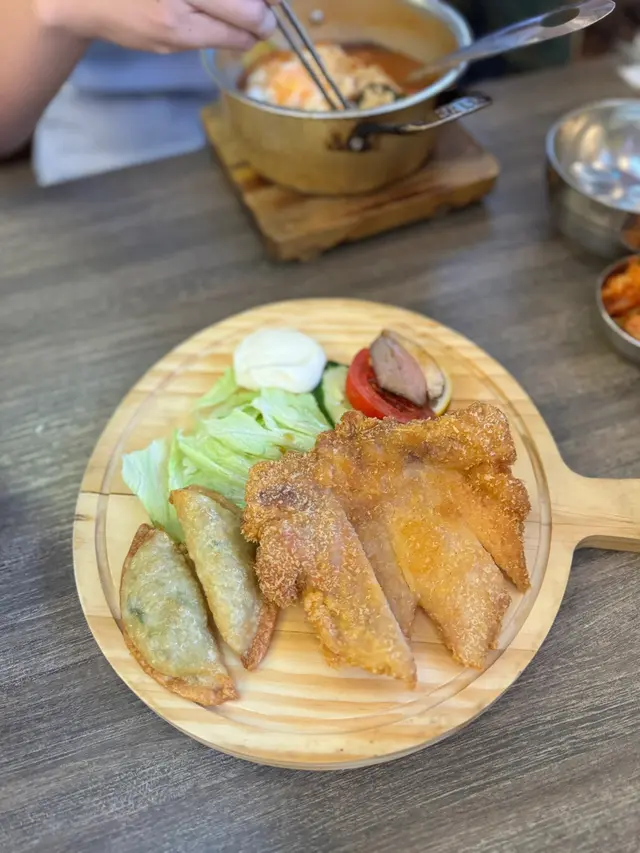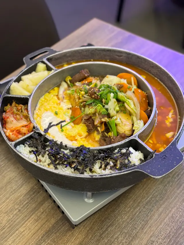 今日到南豐中心行街買野,準備落去川龍旋轉斜路時,望到有間叫「韓閣」的餐廳🍴,仲有個代言Icon 招牌公仔,見幾得意心血來潮走去試下,位置真方便,係正南豐中心後面。韓閣歡樂盤:用上gas爐呈上助熱、選擇困難症的可簡這歡樂盤 ,有曬前菜主菜。特調三重芝士鍋拉絲效果是必需的,因為是三重芝士,層次較豐富,奶香十足,包裹已醃調的牛肉,不錯。韓式牛肉常用醬油、糖蜜、蒜等調料烹調,呈現出濃郁的甜香味。從牛肉本身的肉汁中釋放出來的鮮甜滋味,與調味料形成良好的平衡。將牛肉在烤肉或鐵板上烹調更形成可口的煙燻香氣,配上味素海苔飯,一啖接一啖。用上鐵板烹製的牛油粟米滑蛋好滑捋捋,可即烹即食熱辣辣,充滿粟米香氣帶甜。百香果桂花烏龍:百香果獨特的香甜果香是這款茶的主要風味。百香果的酸甜滋味賦予了茶葉豐富的果香。桂花的淡雅芳香點染了茶葉,使茶飲散發出高雅的花香。清新茶韻:烏龍茶特有的清新茶葉香味成為了這款茶的基底,帶來醇和的茶葉韻味。茶餐:蕃茄辣湯 泡面:蕃茄的酸甜滋味是這道泡麵的基調。湯底充滿了天然的蕃茄鮮甜。配上泡菜,帶來辣味,麵條韌彈:泡麵麵條的韌性和彈性,在湯汁的淹染下盡顯風味。面條做到掛汁效果,整體湯頭濃郁酸甜、辣香、鹹味交織。吉列豬排拼豬肉粉絲餃煙鴨胸沙律🥗:吉列豬排酥脆外皮,油炸後酥香四溢,肉質軟嫩多汁,帶有豬肉本身的甜香味。豬肉粉絲餃:餃子皮Q彈,餡料鮮美多汁。煙鴨胸沙律: 煙燻味道濃郁,帶有一絲苦味,搭配酸甜沙拉醬,形成味道的對比與平衡橙汁菠蘿梳打:濃郁果香:橙汁带来的濃郁柑橘香气,清新酸甜,碳酸梳打水的清爽泡腾感,与酸甜果味形成有趣的反差饮后留有持久的柑橘甜香,令人垂涎欲滴的回味体验。總結:意想不到的高質韓國菜誠意之作的歡樂盤 抵食茶餐查看更多
